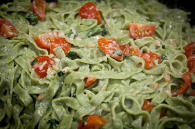 We came up with the brightest green pasta, tossed it with a creamy sauce and then topped it with cherry tomatoes. Amazing!