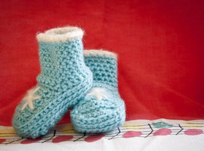 Either way, I thought they were cute and a little kitchy. They don’t have the elegance of a knitted bootie, but functionality outweighs elegance when it comes to clothing a baby.