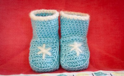 In the past I’ve not admired crocheted objects. They looked icky to me. But during the past couple of years crochet has grown on me. It’s easier and more gratifying than knitting when you’re making blankets. And recently I’ve discovered baby booties go by more quickly on a hook than with needles.