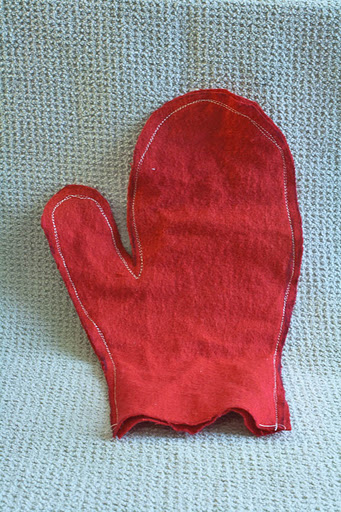Trace the outline of the mitten to a pice of flannel doubled over. Add two inches to the tracing and cut out. Sew double seams all around the flannel mitten. You must make sure you can easily put on the flannel mitten, especially in the wrist area. I had to try a couple of times to get a good fit. Make two and hand sew into the mitten inside-out because that way the raw seams will not be on the inside of the lining.