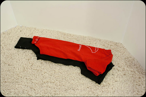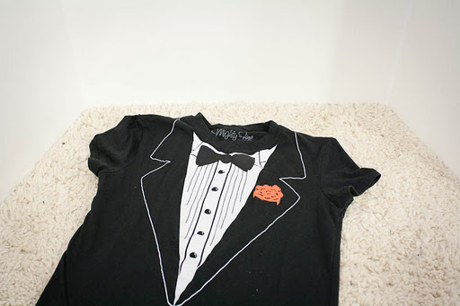 I had so much success with my homemade T-shirt onesie, I couldn’t resist making one out of a tuxedo T-shirt I got from the thrift store.