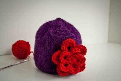 With a name like Jazz I thought I should knit her a baby hat with some real flair. None of this pale pink stuff — I’ve got to go purple and red!