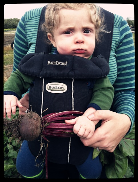 Yesterday my best friend Jess, Jack and I went to a farm in Palmer where you can pick your own produce. They had all kinds of yummy stuff, but we decided to pull up some orangey beets. Jess had previously found some purple potatoes at the state fair and we reconvened at dinner time for a lovely spread of salmon fillet, brown rice, homegrown green salad and a beet and potato au gratin with chèvre. It was positively amazing.
