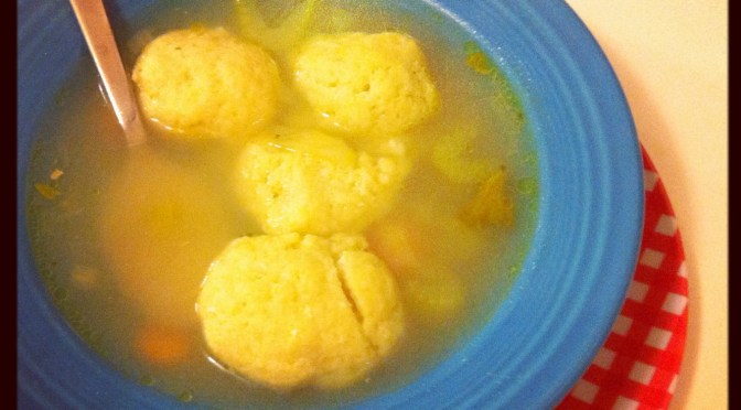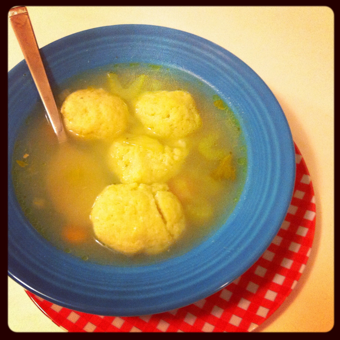 Wet your hands and form the matzoh into walnut-sized balls and drop into the soup. Cover and simmer for 30 minutes. Serve to sick husband.
