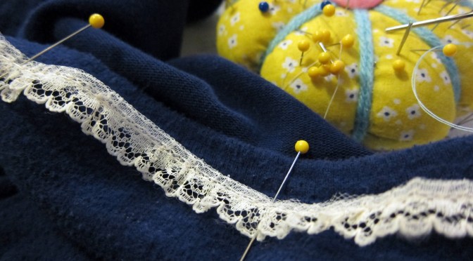 Spruce up an old cardigan with trim. All you need is a sewing machine with a straight stitch and some pins. Months ago I found a big bag of lace trim at the thrift store and I knew it would come in handy some day. Observe this boring but comfy cardi my little sister rejected and I scooped up: