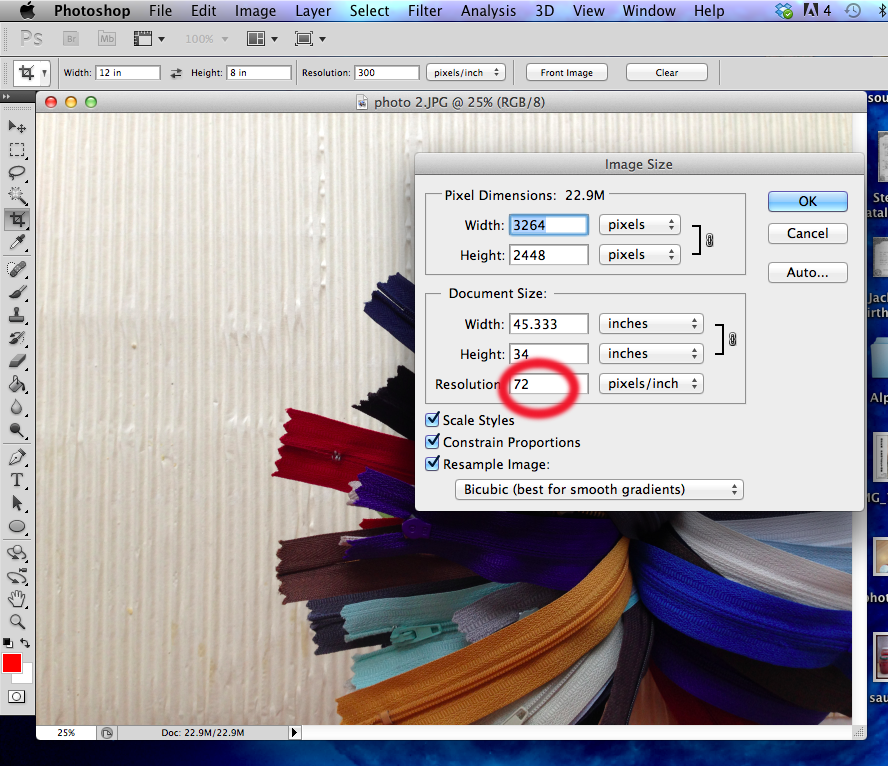 Step 2: Go to Image<Image size and take a look at the size of your photo. If the dpi is 180 or more, you’re good to go. Most of my Instagram and iPhone photos are really low resolution, such as 72 dpi, but really large in dimension, such as 45 inches wide. If you were to just resize the photo and leave a low resolution they wouldn’t print well.