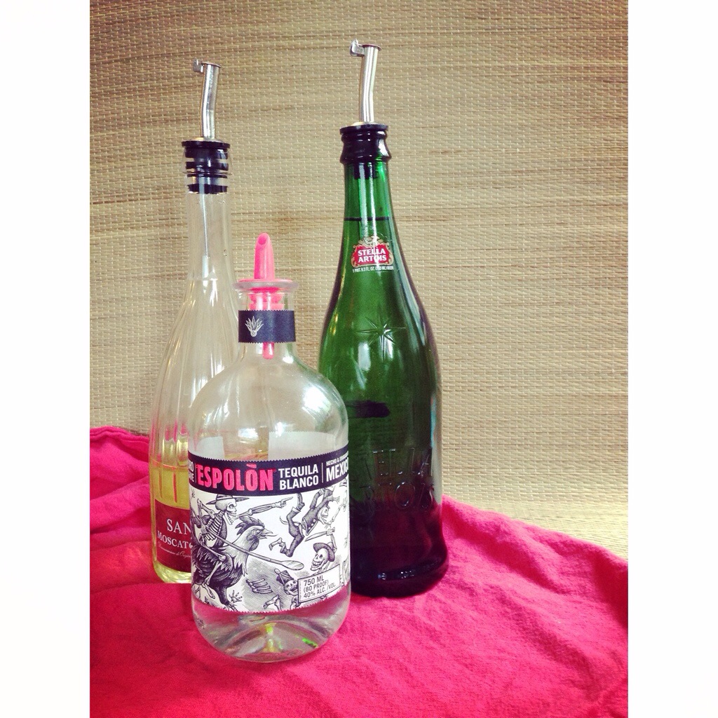Dorothy, I store olive oil, vegetable oil and white vinegar in these bottles. Sometimes I’ll go to a fancy bar and ask if they have any pretty empty bottles.
