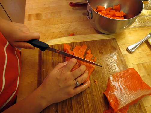 Using a sharp filet knife, remove the skin from the salmon filets. If there are any pin bones, carefully remove them with needle nose pliers. Cut the salmon into bite-sized cubes.