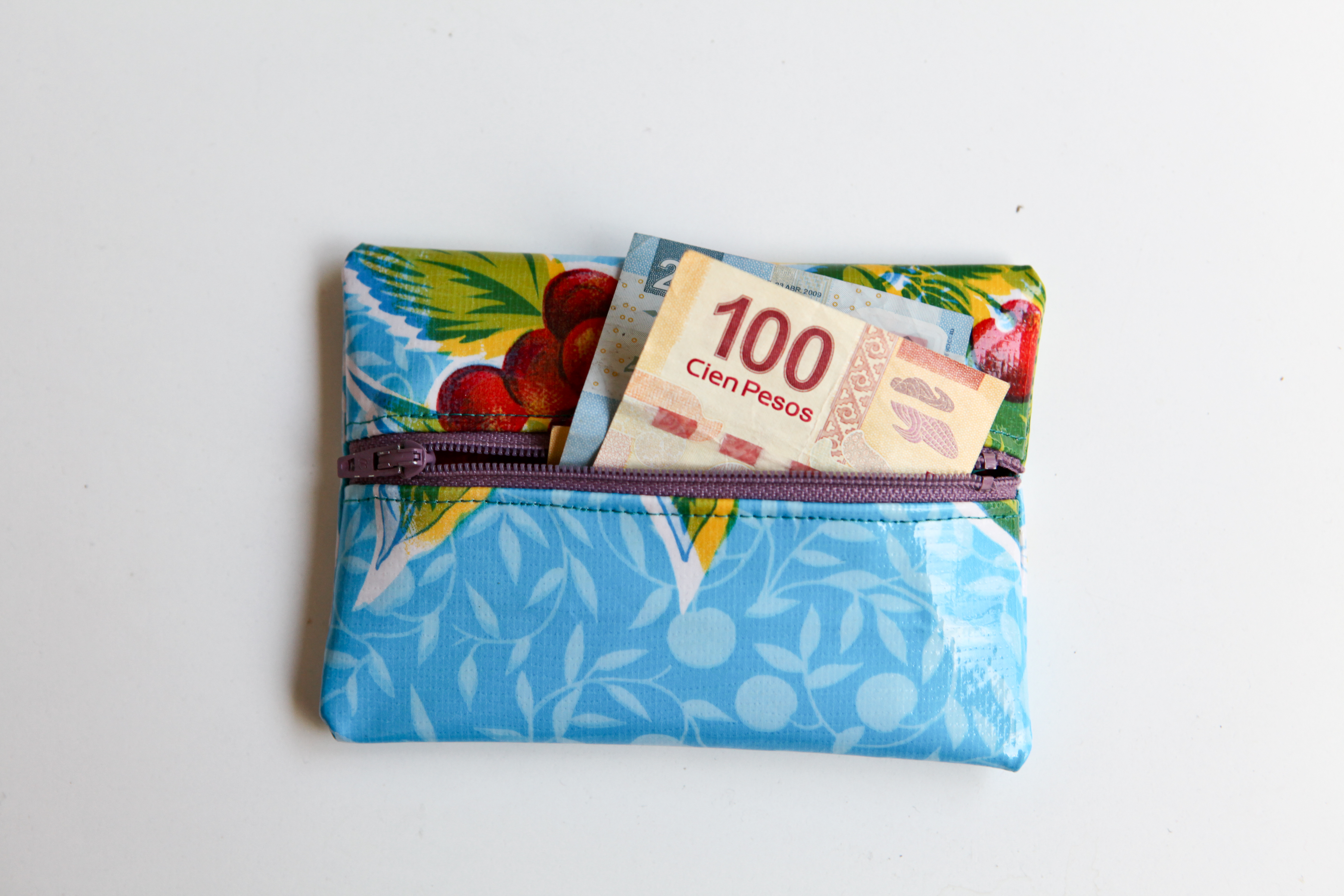 Every time I travel to Mexico I can’t resist buying a meter or two of brightly colored oilcloth. You see it everywhere down there, mostly as cheerful tablecloths. I use it for just about everything. I cover cans with it, I reupholstered my dining chairs and I love to use it for coin purses.