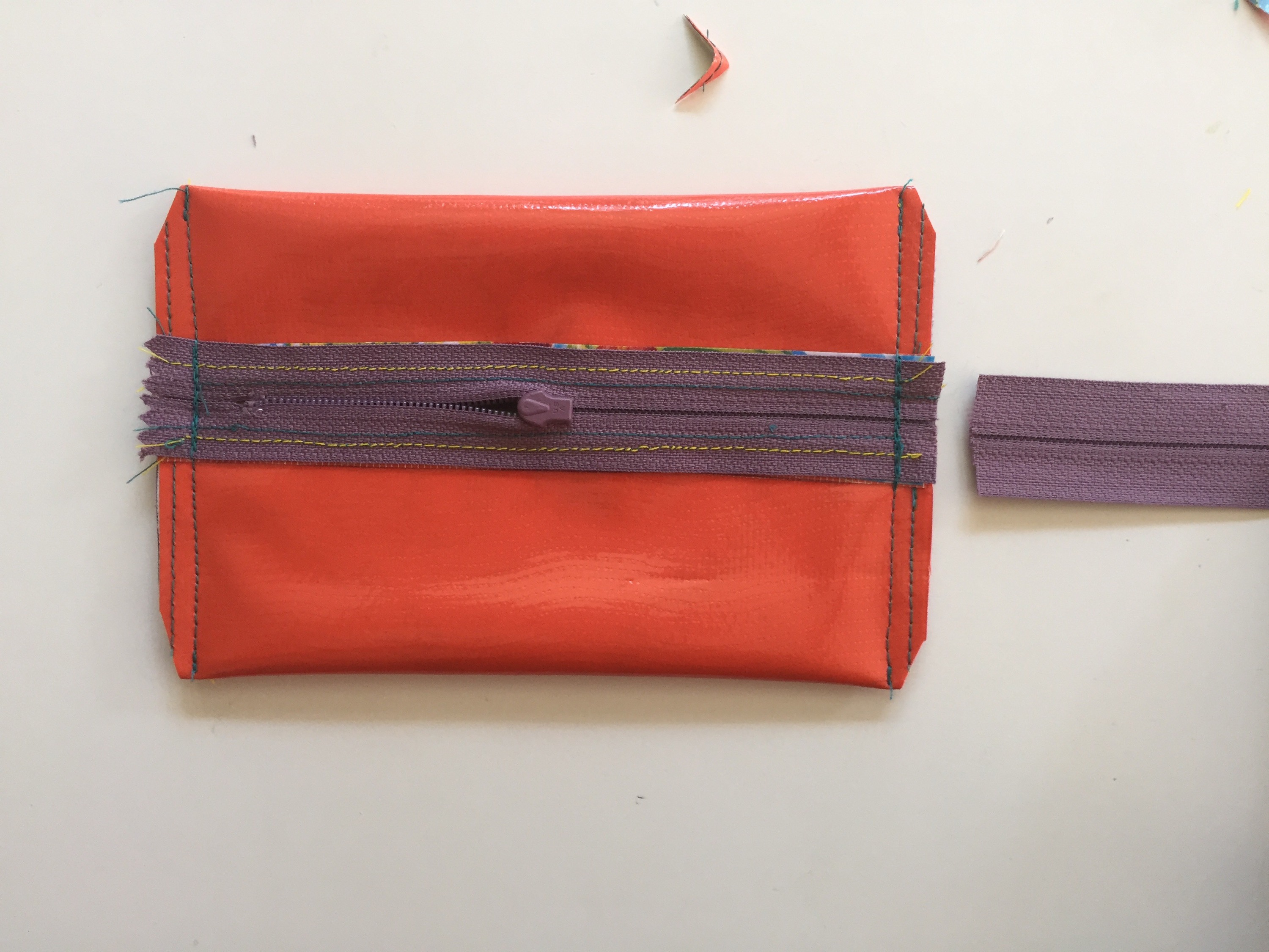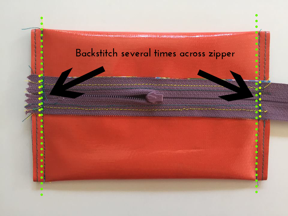 5. Flip the zipper back and top stitch along the right side of the oilcloth on top of where you just sewed.
