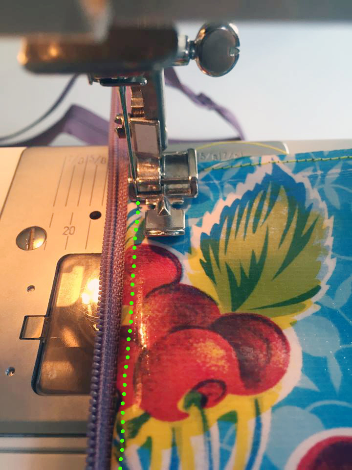 4. Sew the other side of the zipper the same way, with the right side of the zipper facing the outside oilcloth. This is the part that always confuses me — don’t feel bad if you have to rip this stitch and try again! See image below to get a better idea.