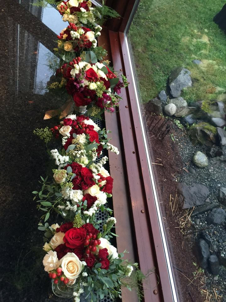 Alaska Winter Wedding | White and red roses, white and burgundy carnations, eucalyptus, red snapdragon, red hypericum, plumosa and spray roses. The perfect holiday bouquet from alaskaknitnat.com
