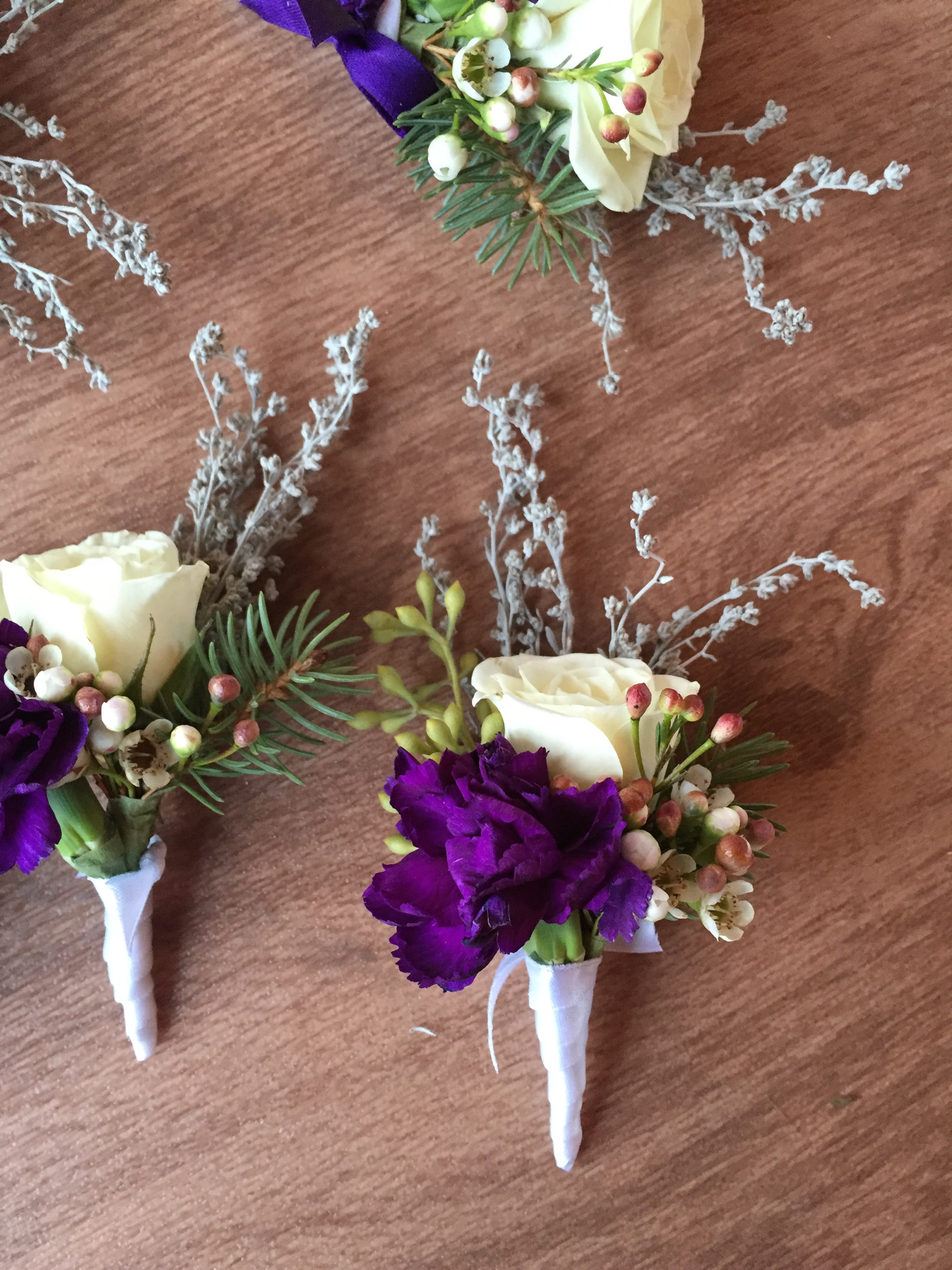 Alaska Winter Wedding | corsages made with white spray roses, statice, sage, mini myrtle, eucalyptus and purple mini carnations. Designed by Natasha Price of Alaskaknitnat.com