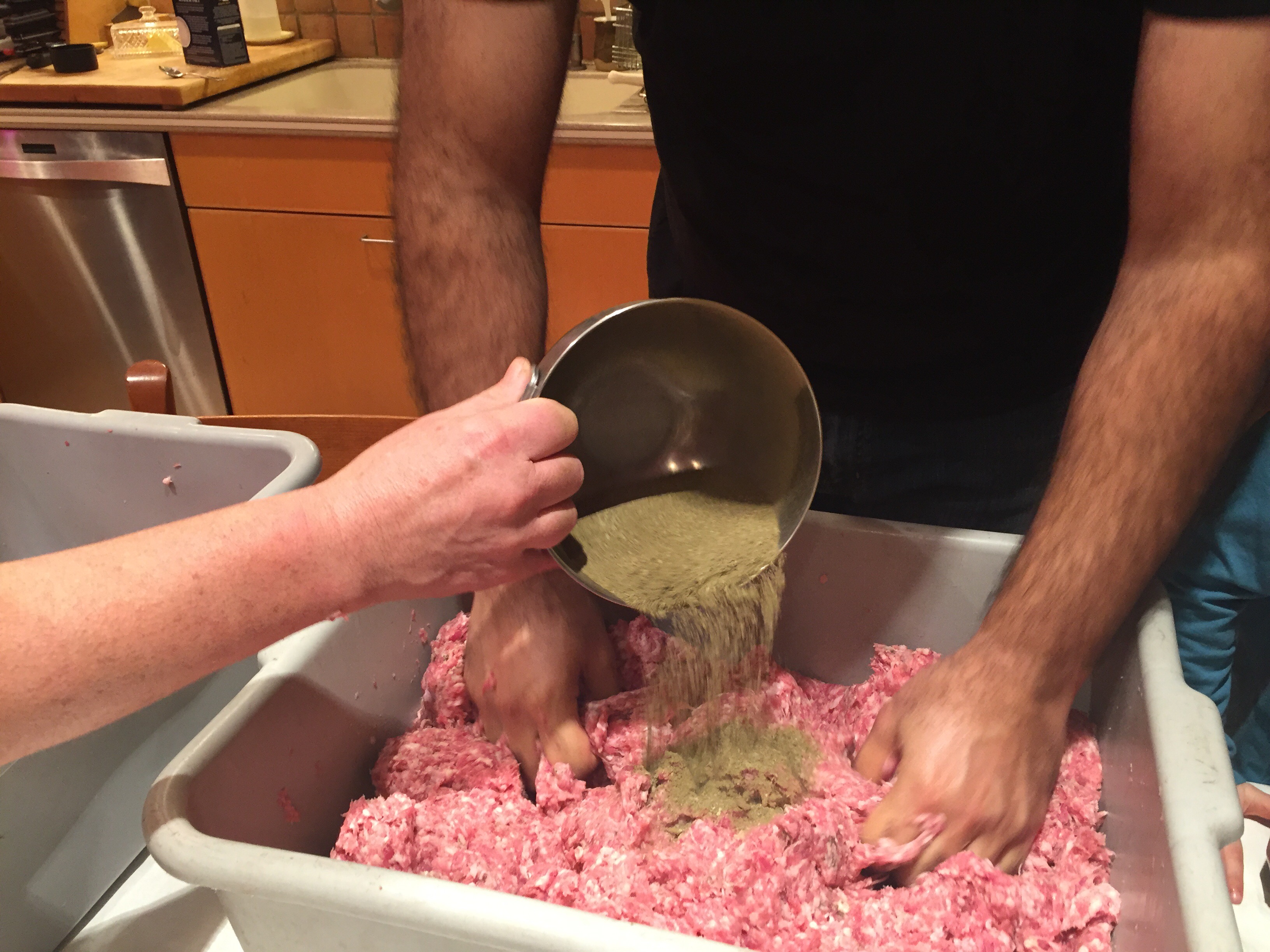 Mixing sausage is great for an upper body workout! It’s very important to keep mixing and mixing until there are no hidden pockets of spices left: you don’t want one of your guests chomping down on a sausage filled with nothing but garlic or pepper!