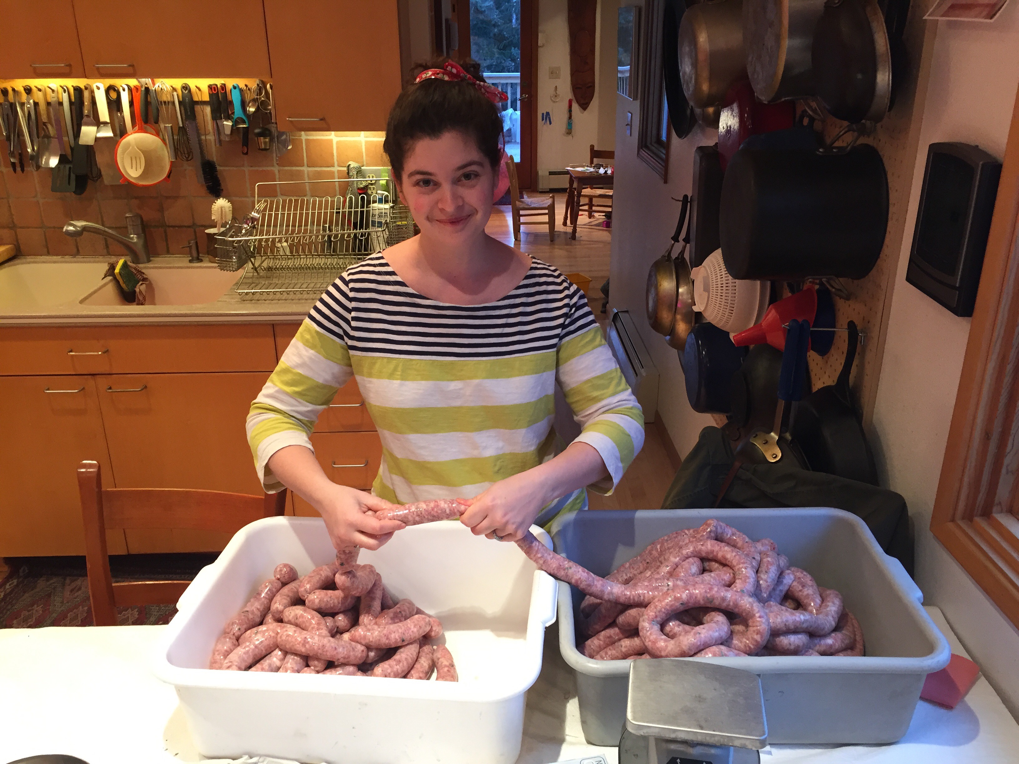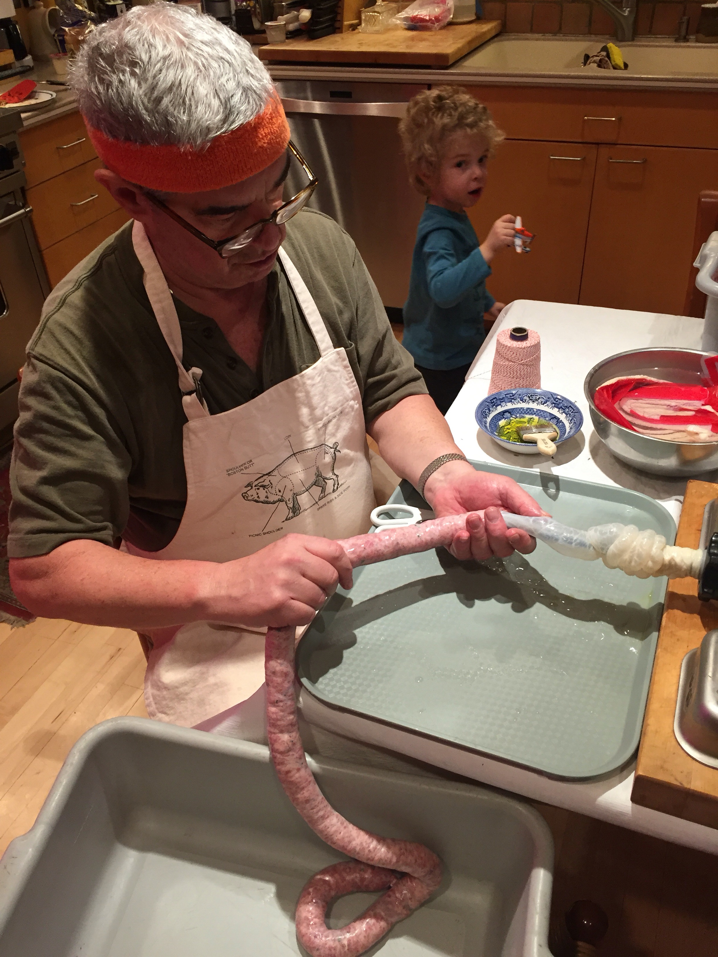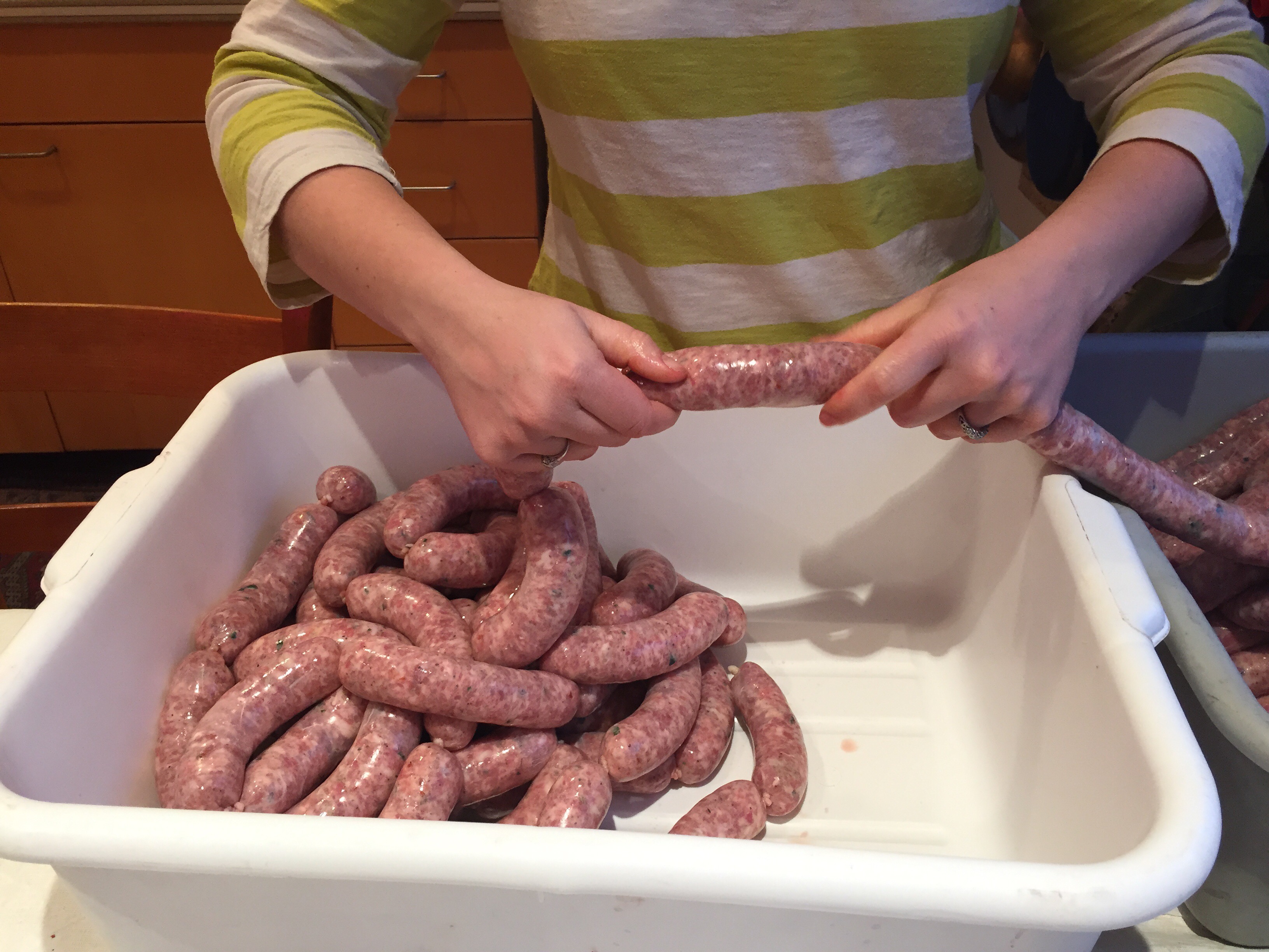 One staple in our family is sausage. I remember waking up early on Saturday morning to the loud humming of my dad’s homemade motorized sausage grinder. I was thrilled to stuff hog intestines with meat — I was the best sausage stuffer in the family thanks to my deft, friendship bracelet-making hands.