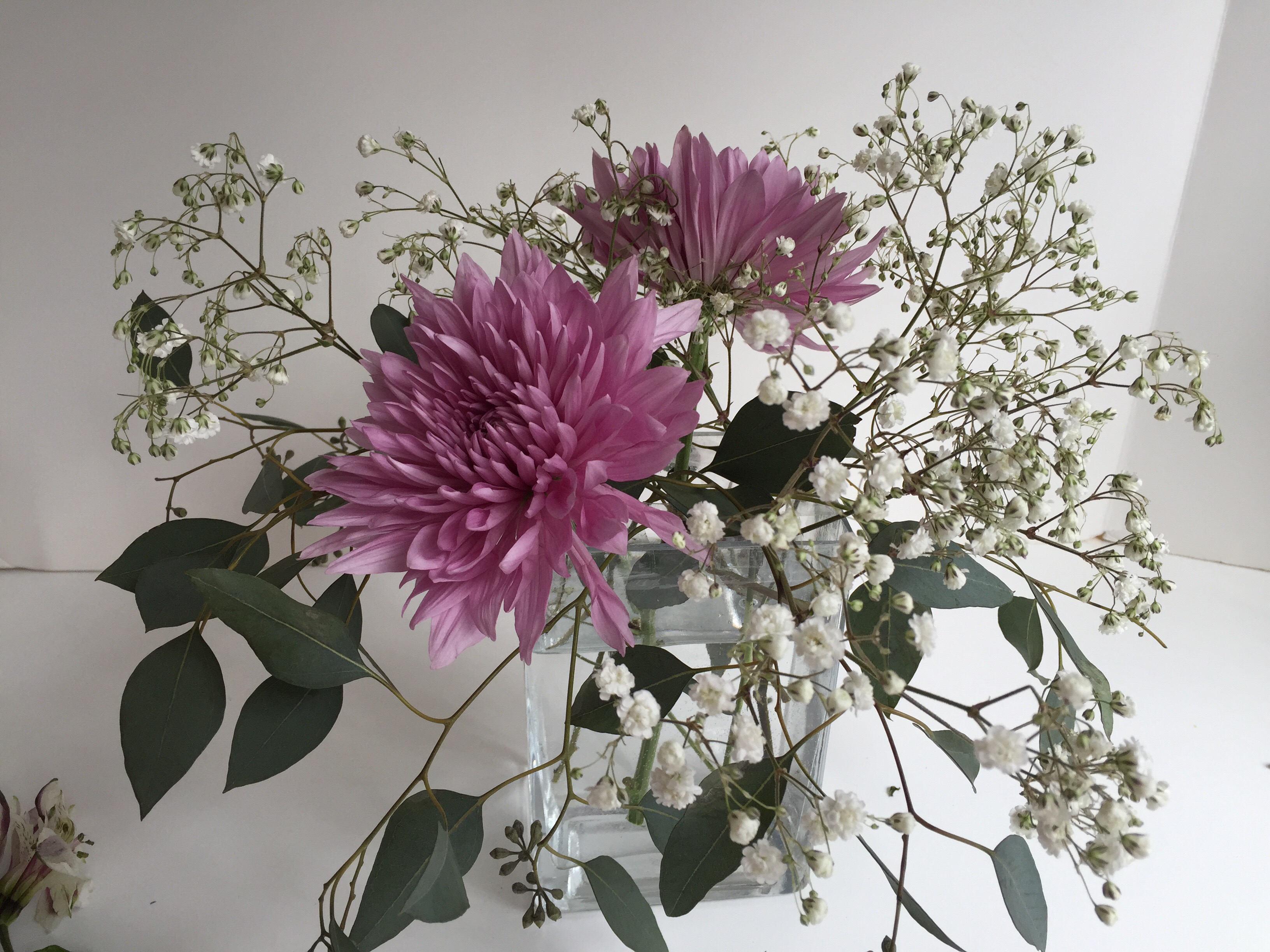DIY Mother’s Day arrangement | Make a beautiful floral centerpiece in just a few simple steps using eucalyptus, baby’s breath, alstroemeria and football mums. Tutorial by alaskaknitnat.com