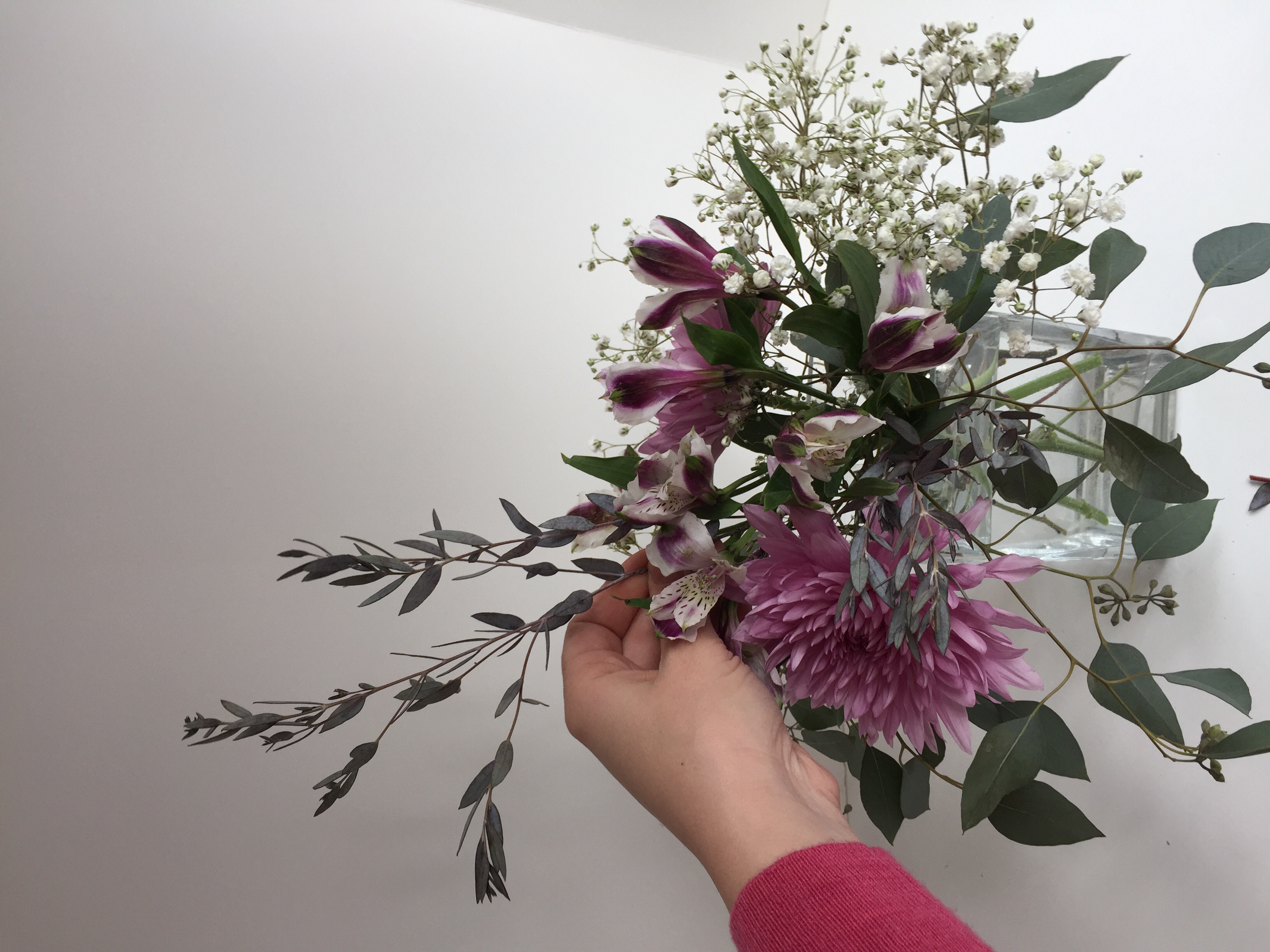 DIY Mother’s Day arrangement | Make a beautiful floral centerpiece in just a few simple steps using eucalyptus, baby’s breath, alstroemeria and football mums. Tutorial by alaskaknitnat.com