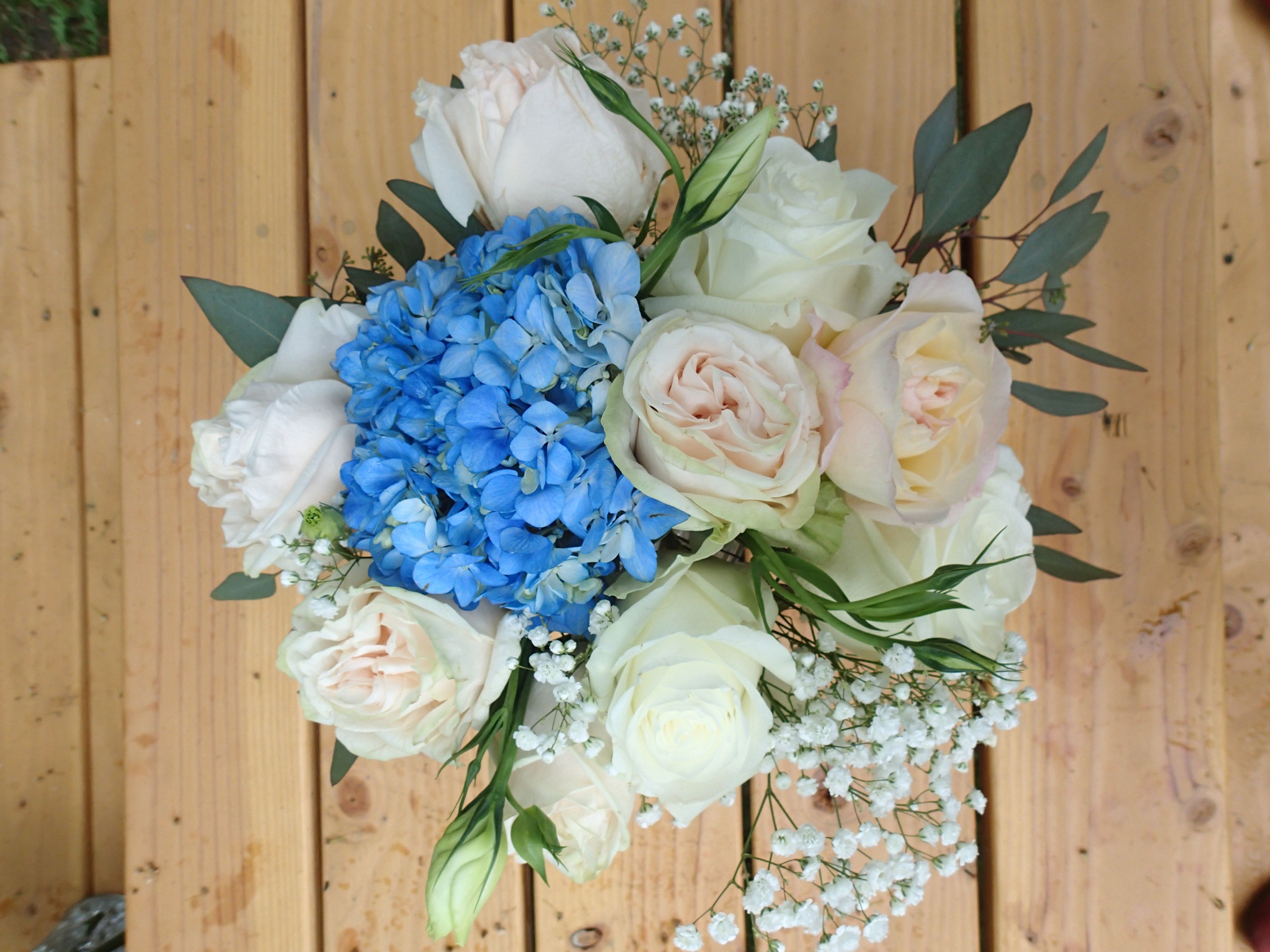 Garden roses, blue hydrangea, lisianthus, baby’s breath limonium, seeded eucalyptus and dusty miller | Such a romantic, soft palate for a June wedding. Designed by Natasha Price of Alaskaknitnat.com