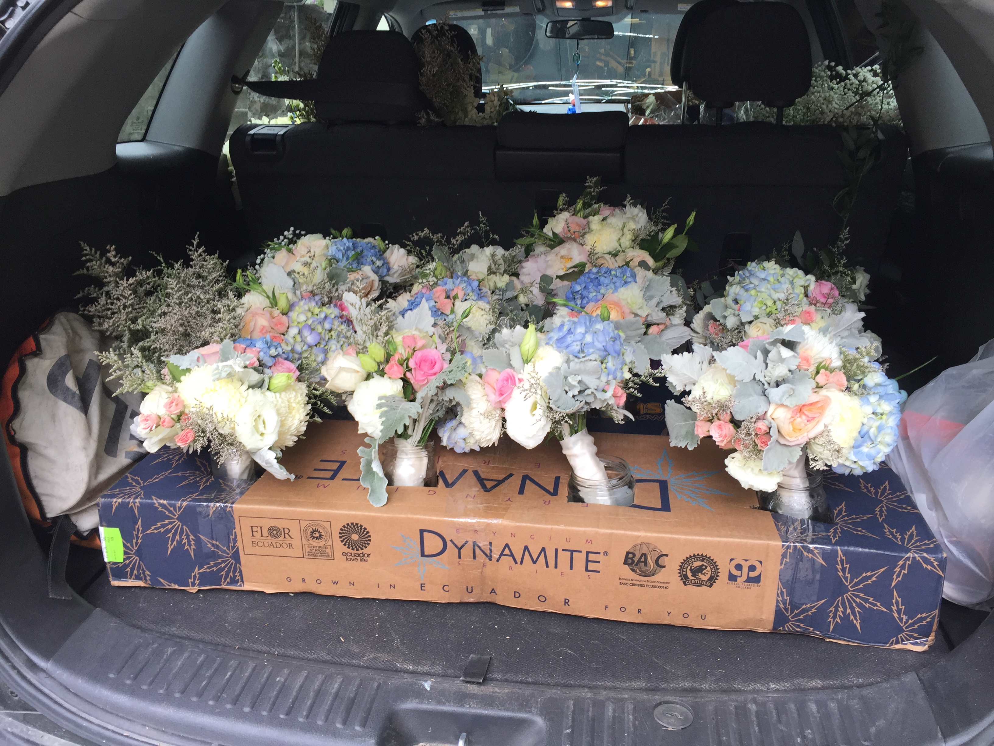 Garden roses, blue hydrangea, lisianthus, baby’s breath limonium, seeded eucalyptus and dusty miller | Such a romantic, soft palate for a June wedding. Designed by Natasha Price of Alaskaknitnat.com