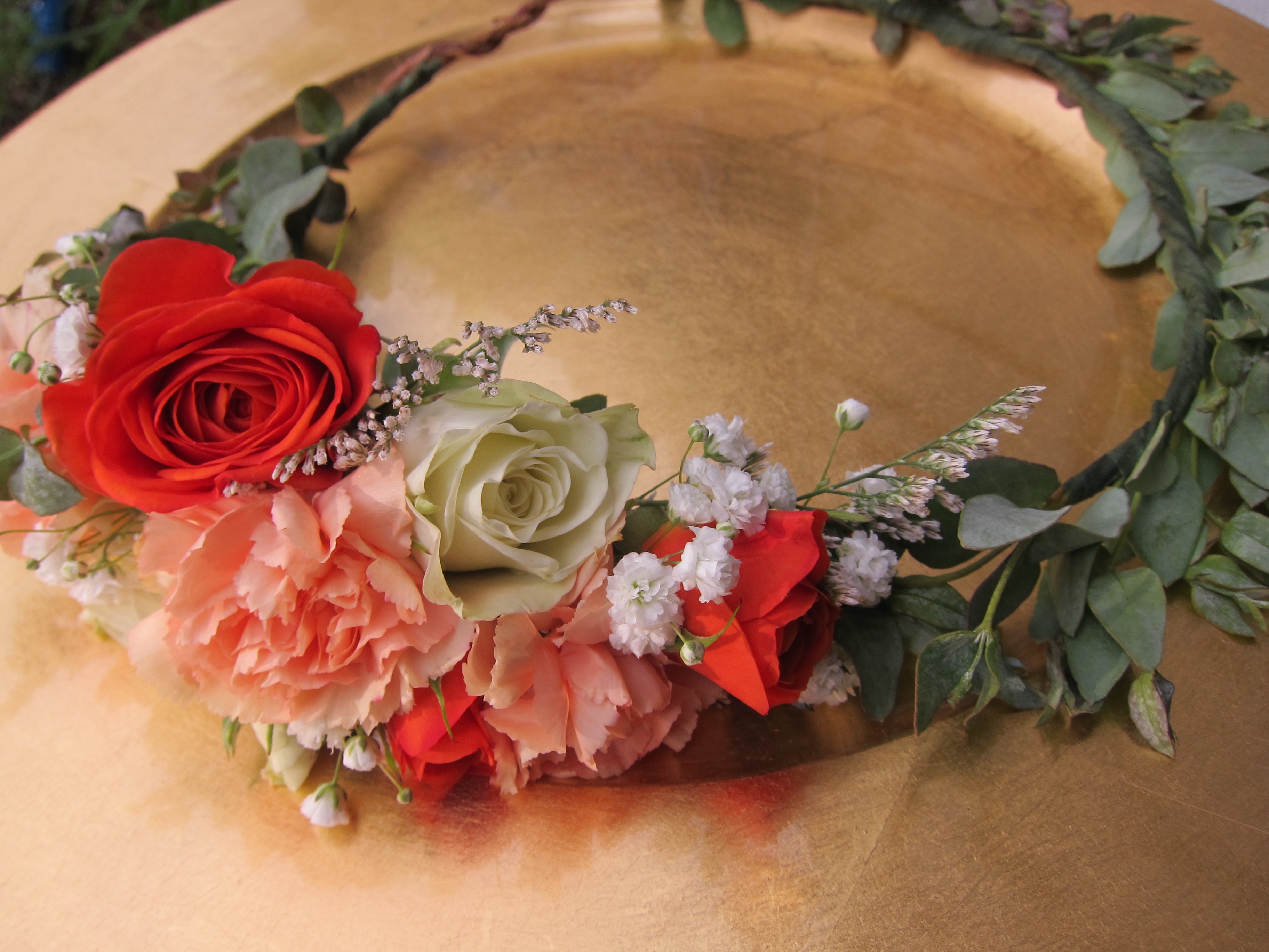 Flower crown made with eucalyptus, limonium, spray roses and mini carnations | Designed by Natasha Price of Alaskaknitnat.com August 13, 2016 3648 × 2736 Alaska Weddings: Desiree + Geoffrey Flower crown made with eucalyptus, limonium, spray roses and mini carnations | Designed by Natasha Price of Alaskaknitnat.com