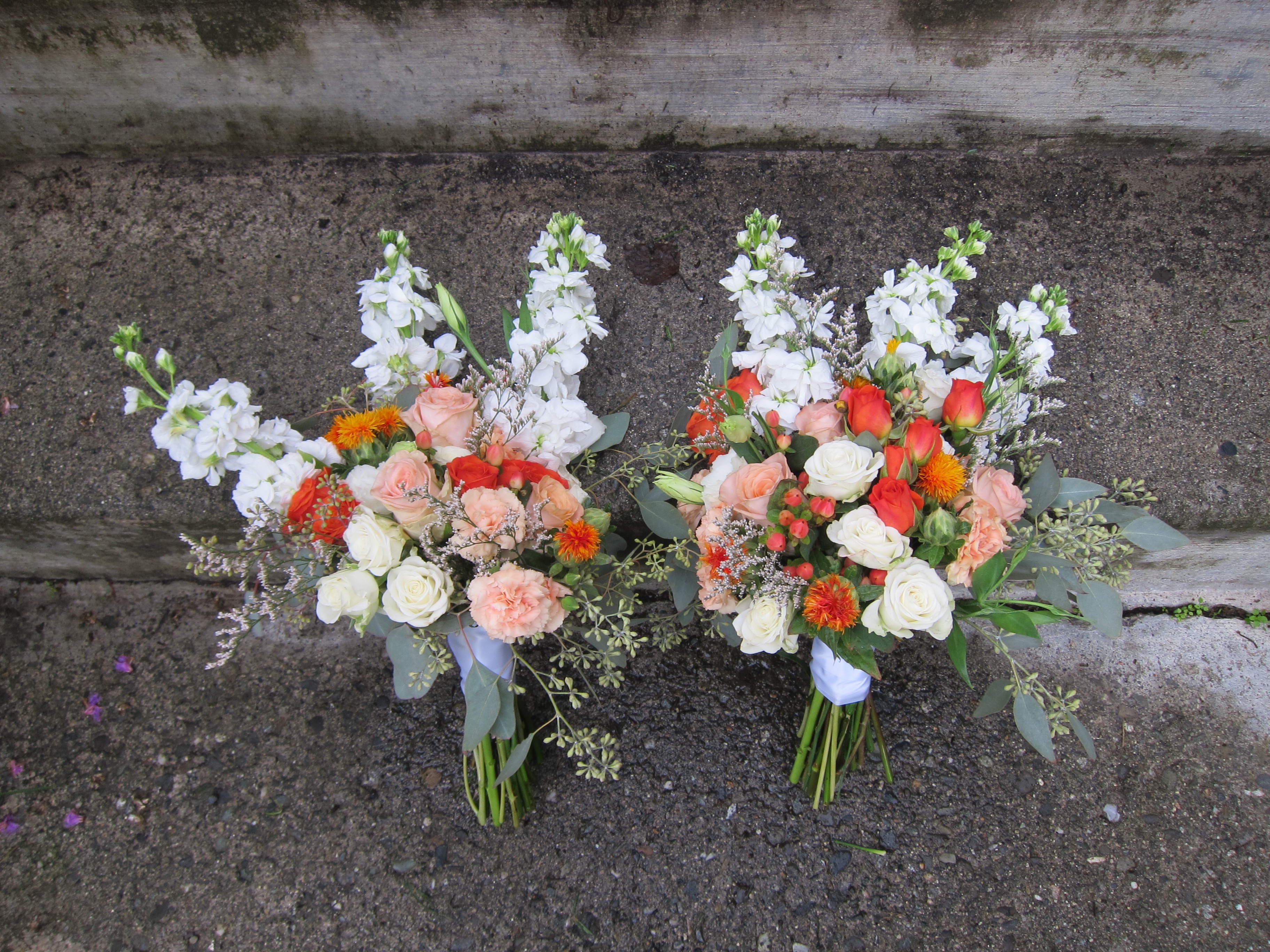 A creamsicle wedding | bridal bouquet made with peach roses, football mums, snapdragon, spray roses, lisianthus, limonium, hypericum, safflower and seeded eucalyptus. Designed by Natasha Price of Alaskaknitnat.com