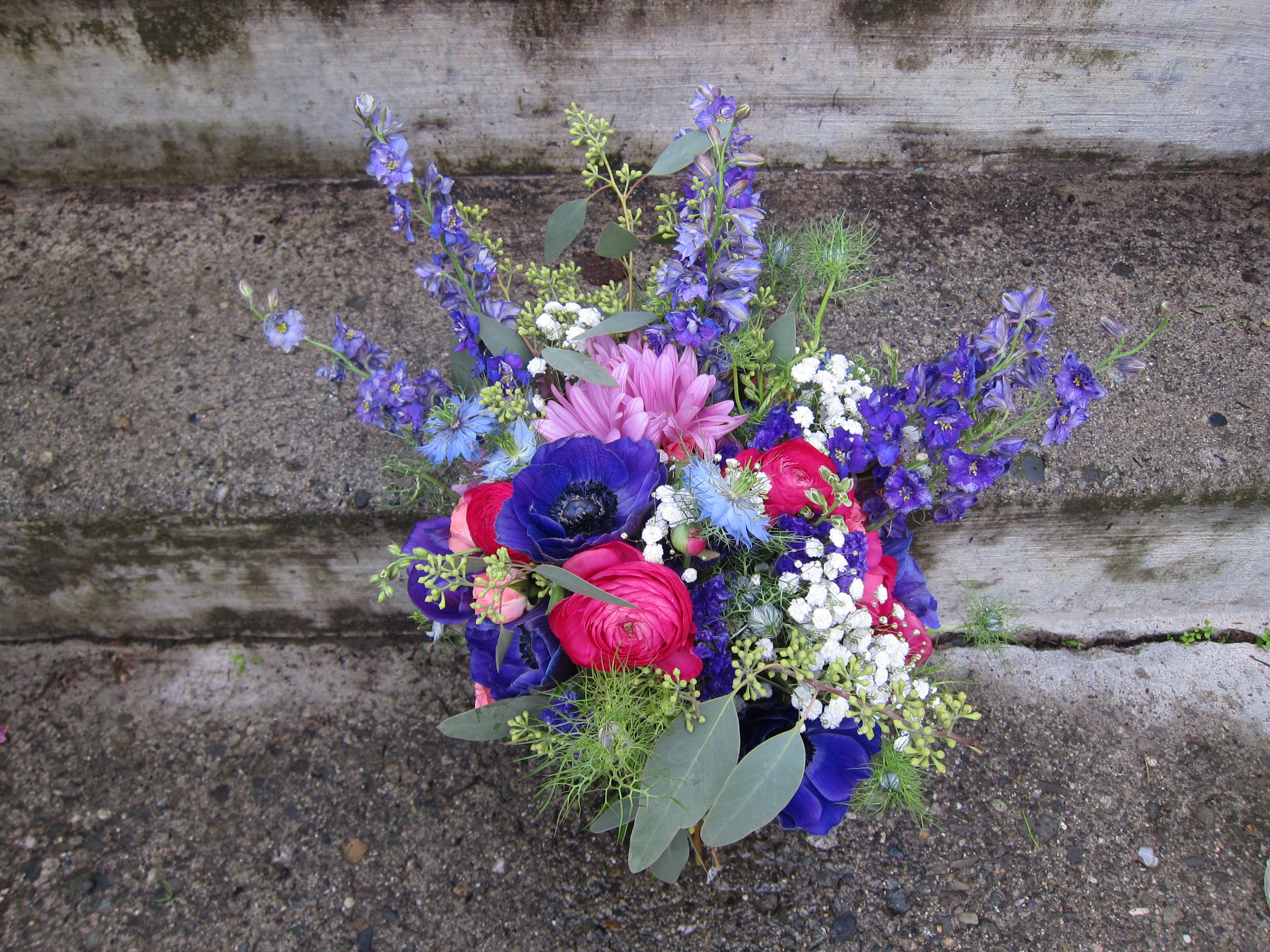 Bridal bouquet made with purple anemones, fuchsia ranunculus, blue nigella, purple larkspur, daisies, baby’s breath, pink spray roses and seeded eucalyptus | designed by Natasha Price of Alaskaknitnat.com