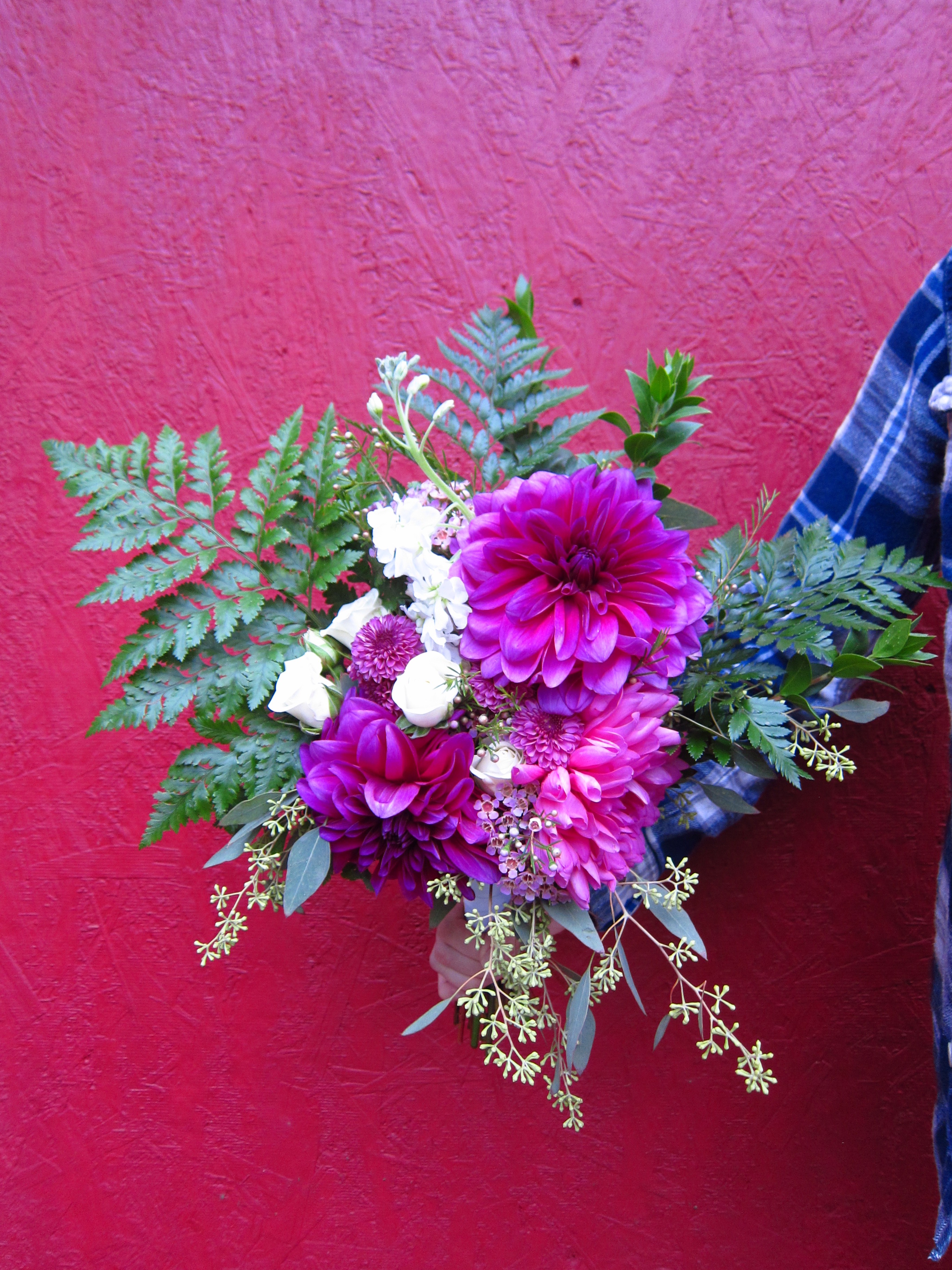 A stunning wedding bouquet with a dinner plate dahlia, gold eucalyptus, ferns, myrtle, waxflower and spray roses | Designed by Natasha Price of alaskaknitnat.com