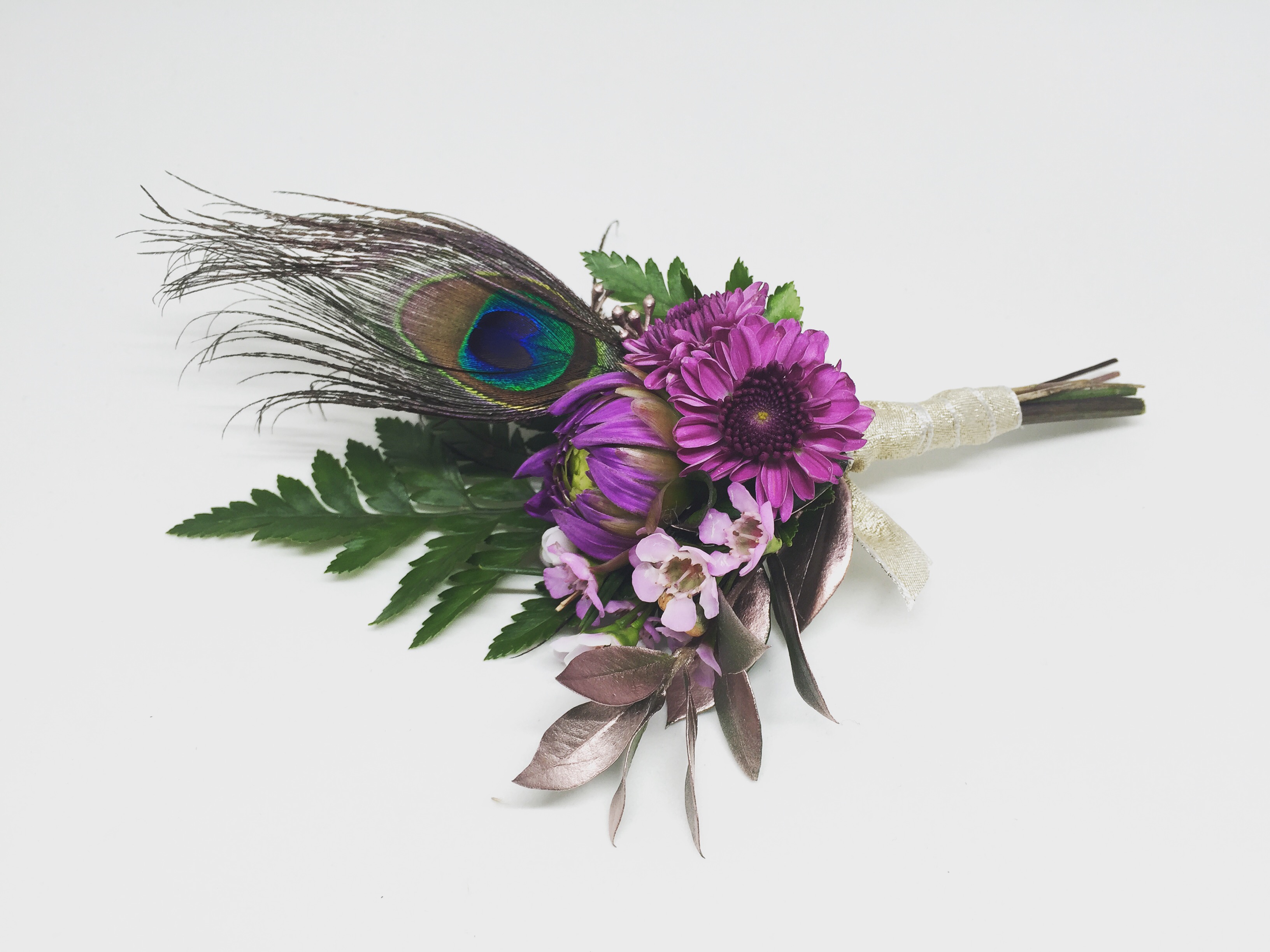 Boutonniere made with button mums, dahlia bud, waxflower, fern and peacock feather | designed by Natasha Price of alaskaknitnat.com August 23, 2016 3264 × 2446 Alaska Weddings: Roxanne + Michael Boutonniere made with button mums, dahlia bud, waxflower, fern and peacock feather | designed by Natasha Price of alaskaknitnat.com
