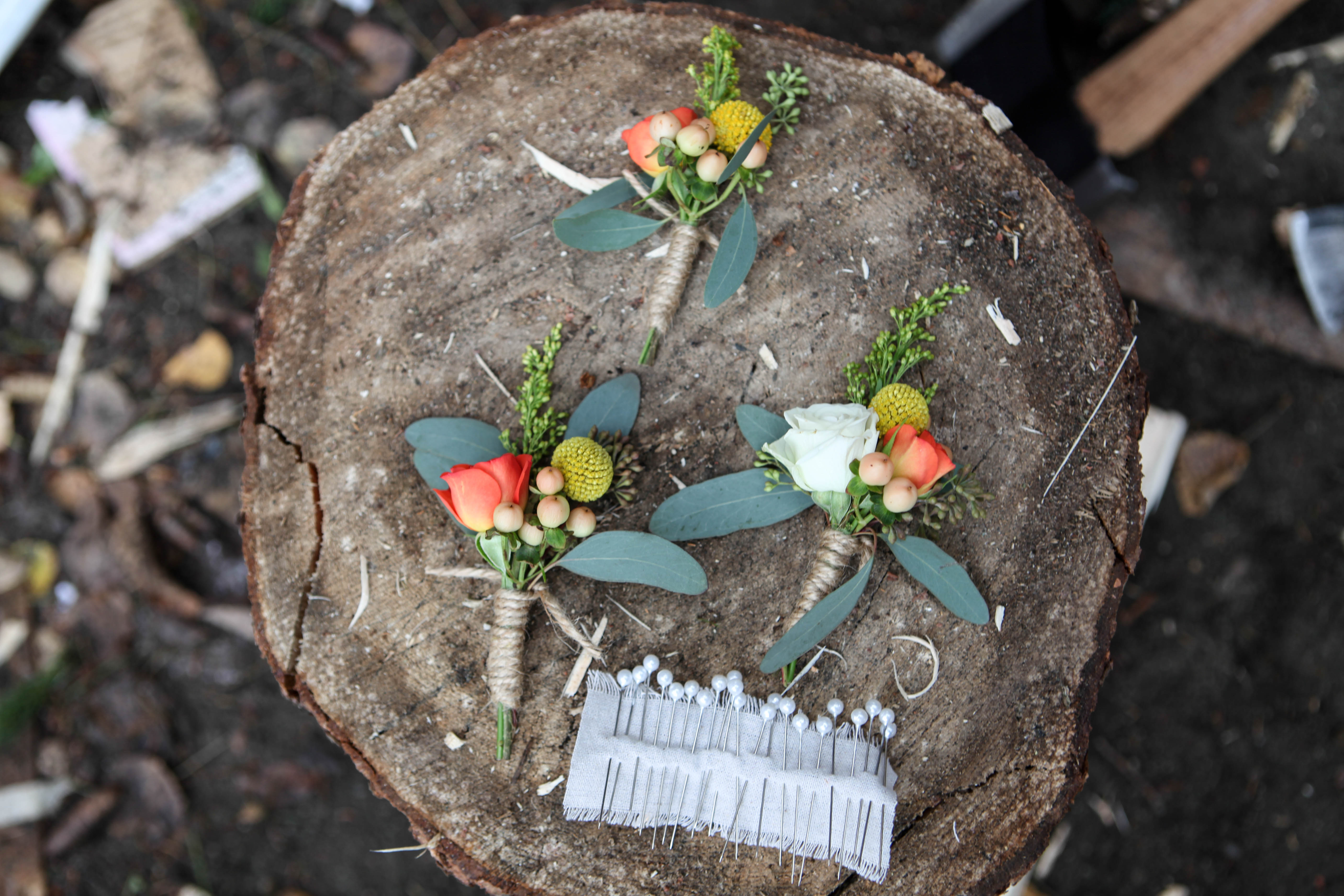 Autumn boutonnieres with orange spray rose, billy ball, hypericum, solidago and seeded eucalyptus | designed by Natasha Price of alaskaknitnat.com October 1, 2016 5616 × 3744 Alaska Weddings: Lena + Ivan Autumn boutonnieres with orange spray rose, billy ball, hypericum, solidago and seeded eucalyptus | designed by Natasha Price of alaskaknitnat.com