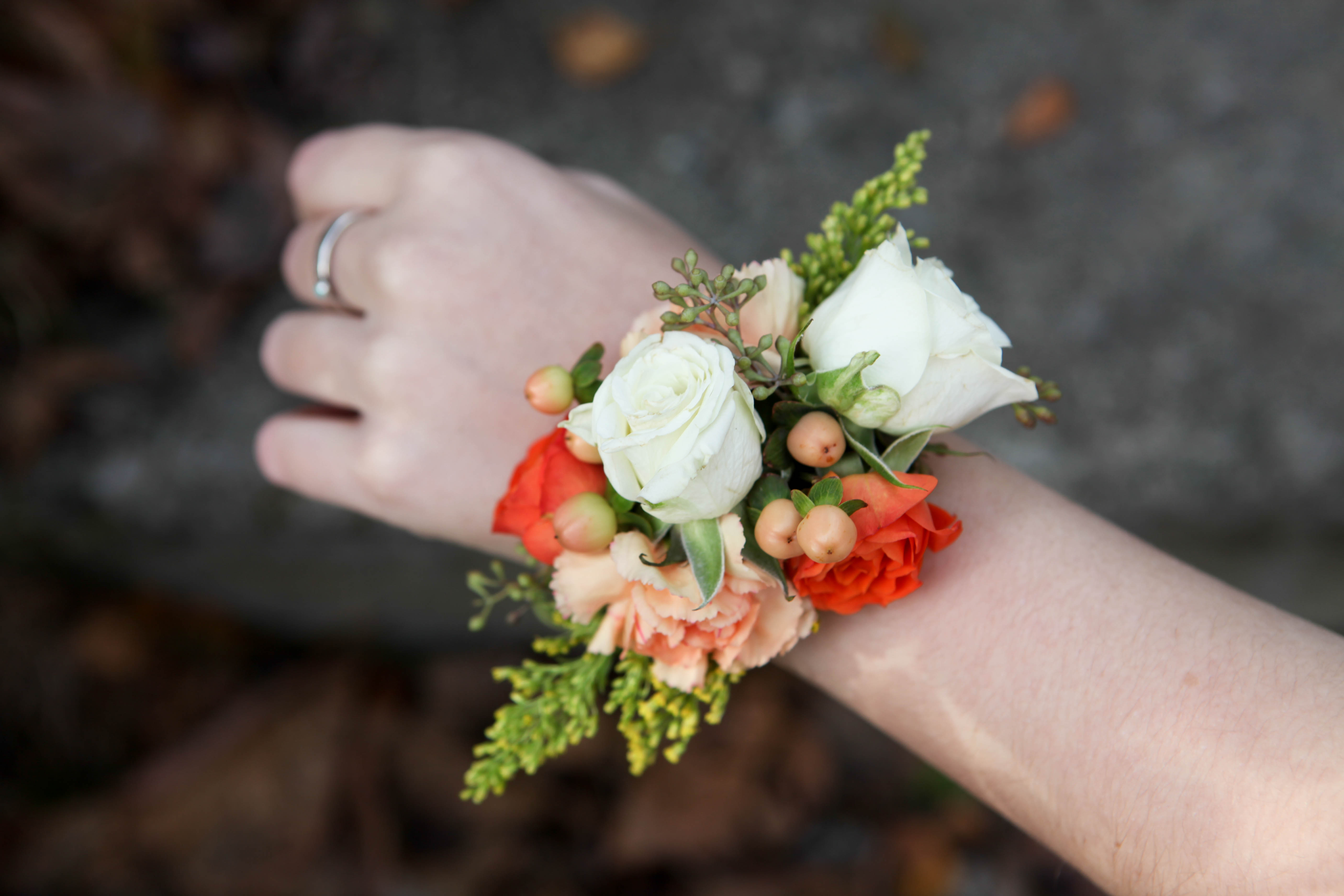 Autumn wrist corsage made with orange spray rose, billy ball, hypericum, solidago and seeded eucalyptus | designed by Natasha Price of alaskaknitnat.com