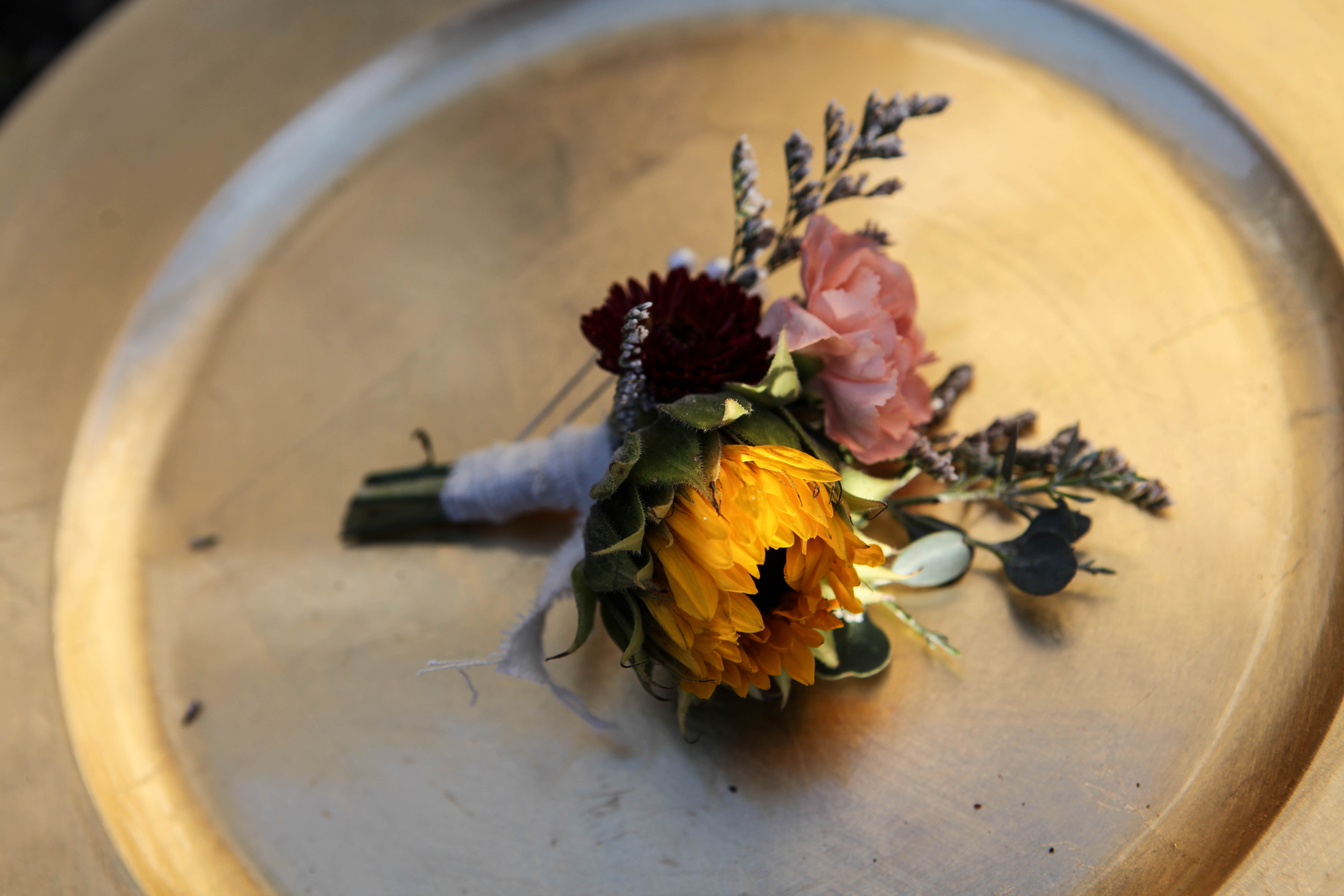 rustic fall wedding boutonniere made with mini carnation, burgundy button mum, mini sunflower, eucalyptus and limonium | Designed by Natasha Price of Alaskaknitnat.com