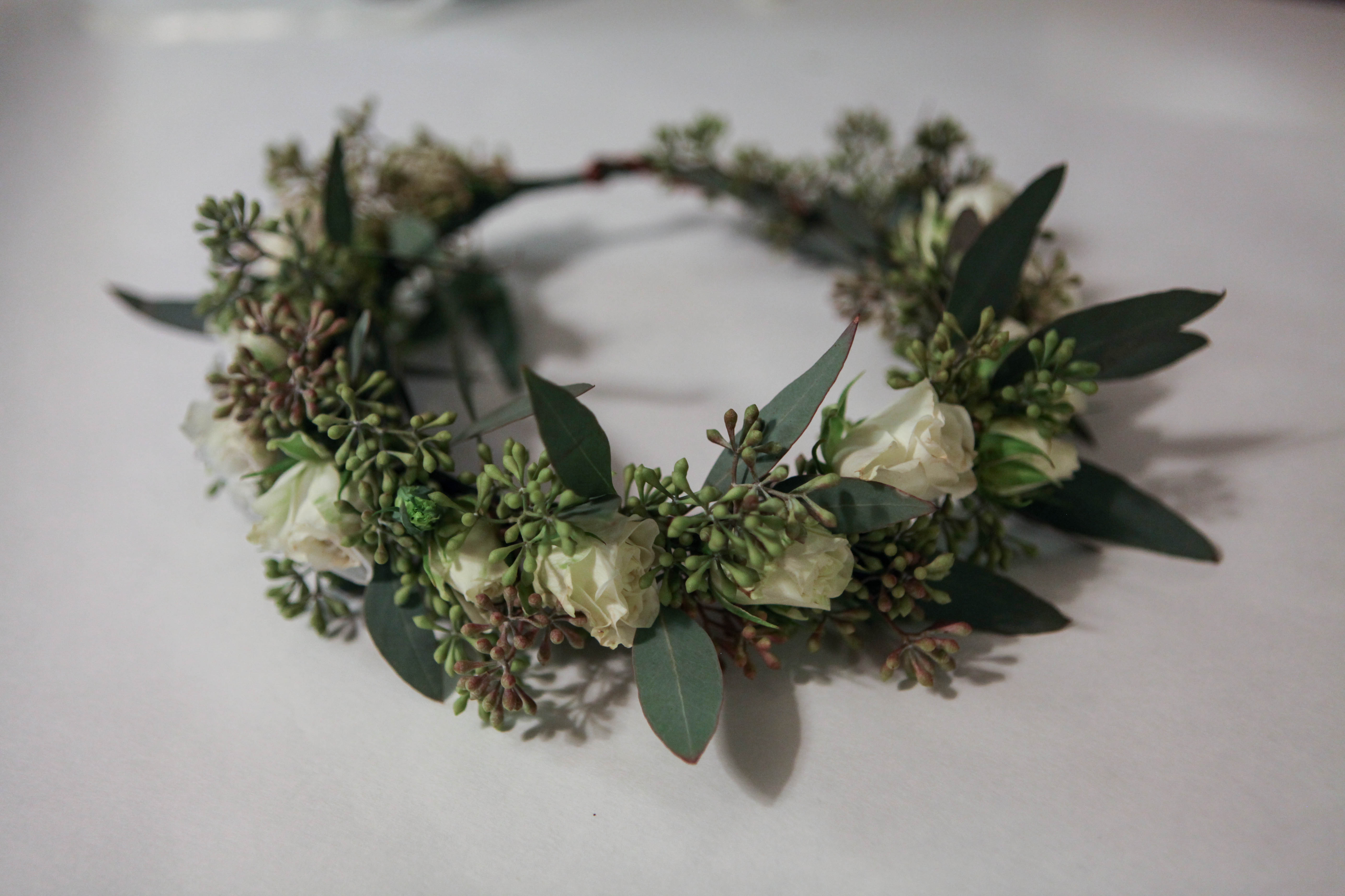 Flower crown made with seeded eucalyptus and white spray roses | designed by Natasha Price of alaskaknitnat.com