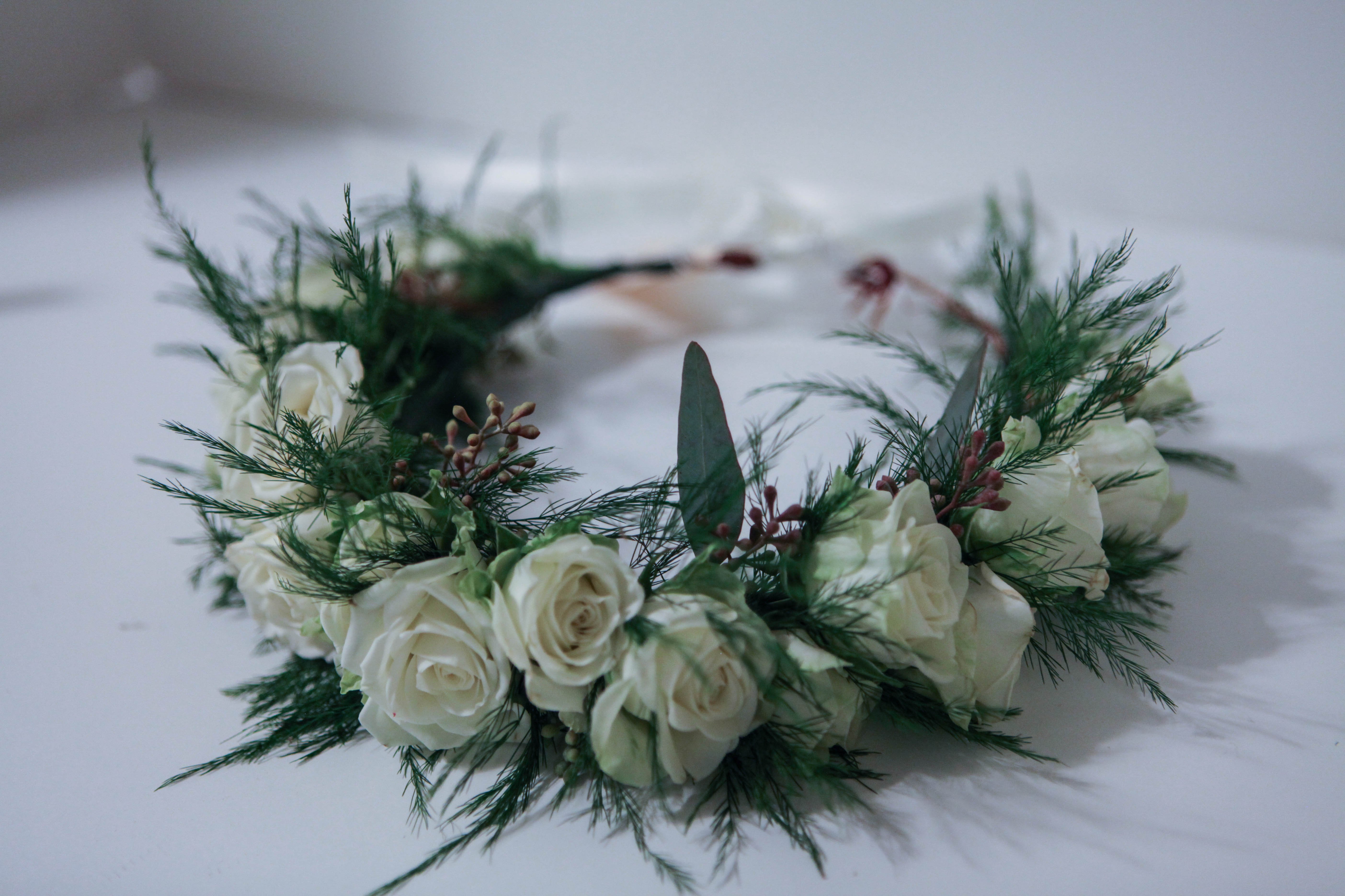 Flower crown made with seeded eucalyptus and white spray roses | designed by Natasha Price of alaskaknitnat.com October 27, 2016 5616 × 3744 Alaska Weddings: Ariel + Erik Flower crown made with seeded eucalyptus and white spray roses | designed by Natasha Price of alaskaknitnat.com