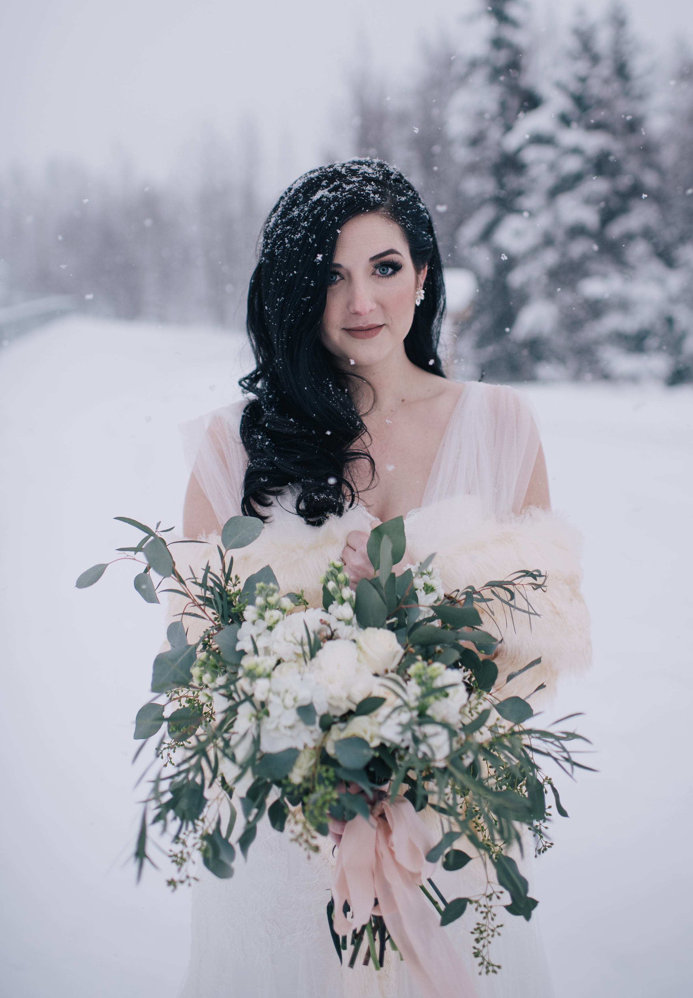 The perfect winter wedding bouquet | roses, stock, waxflower and carnation mixed with eucalyptus. Flowers by Natasha Price and photo by Erica Rose Photography