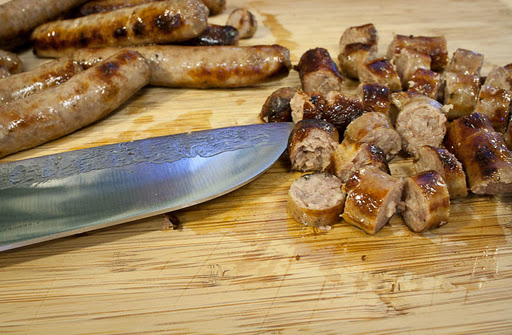 Brown all the sausage links in a big sauté pan. Once they are cooled, chop them into little rounds.