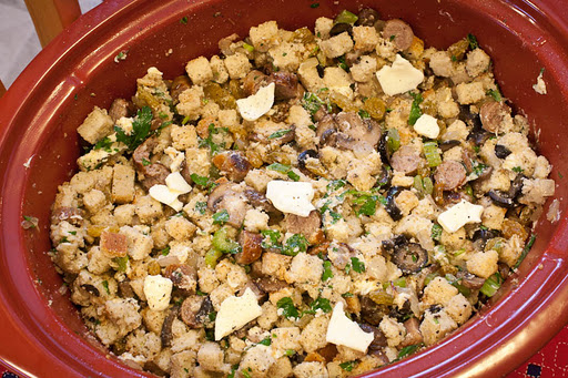 Spray the inside of your slow cooker with cooking spray and add the stuffing. Dot with a little more butter if you have some.