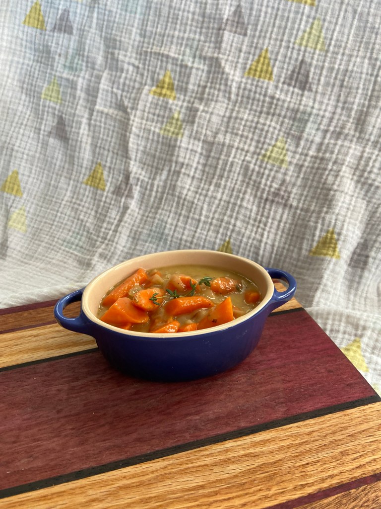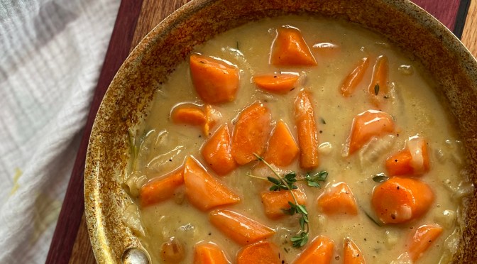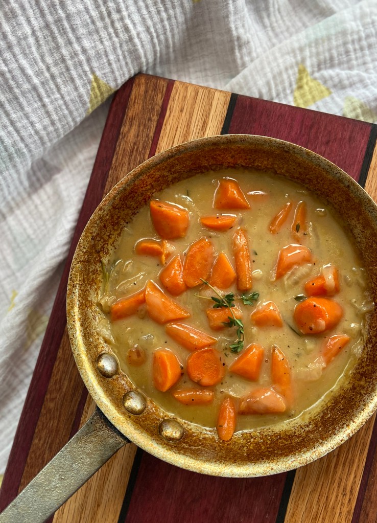 I recently came across an Instagram reel from Corre Larkin for Julia Child-inspired creamed carrots. I’m always at a loss for how to serve cooked carrots and this recipe is a game changer. It is so flavorful and satisfying. The carrots are coated in silky, tangy gravy. Gravy is liquid of the gods!