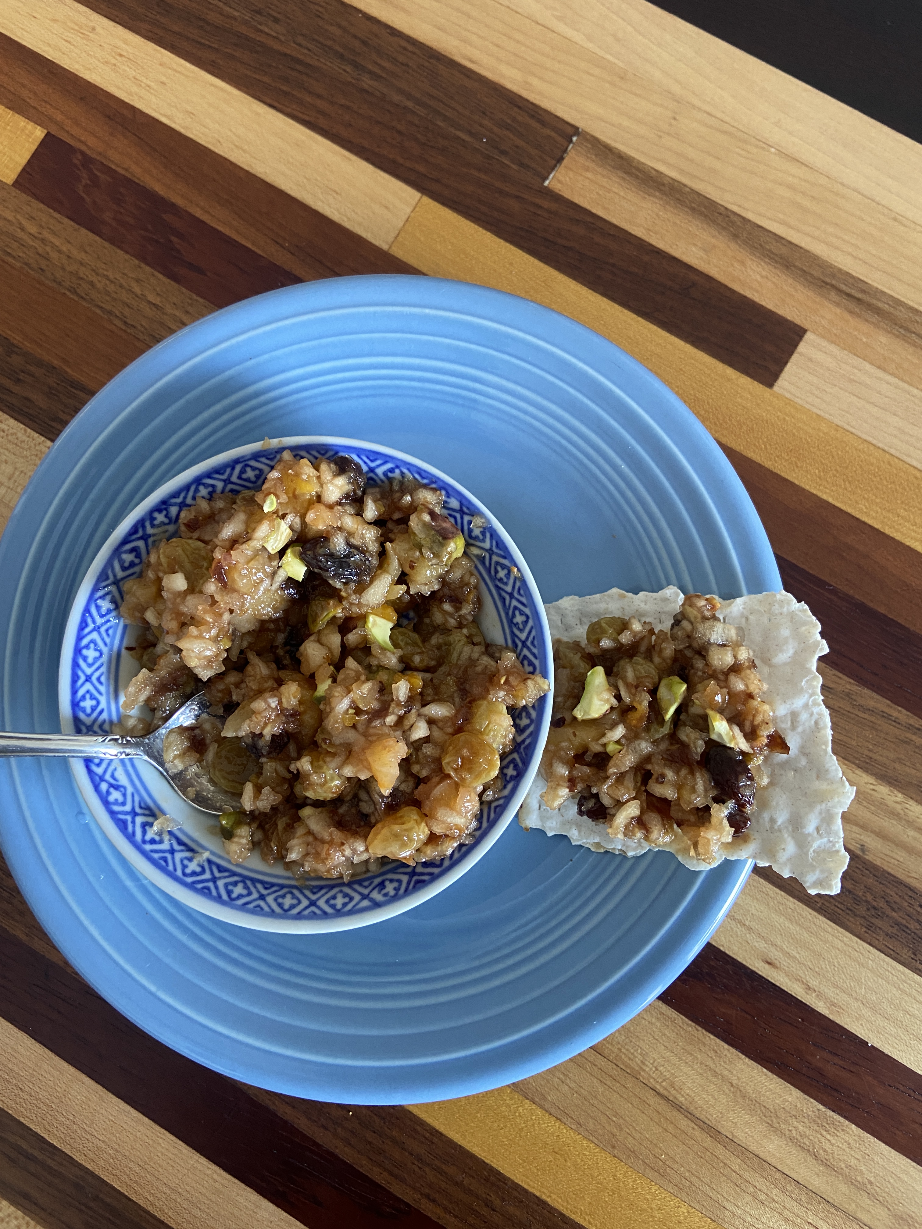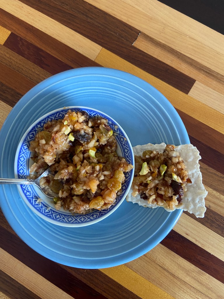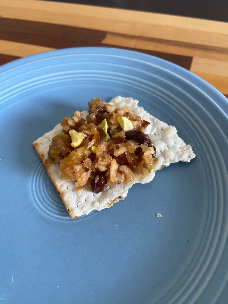 It’s super adaptable. For instance, she only had pistachios this week instead of pine nuts, and prunes instead of dates. Basically, if you’re throwing together chopped up apples, dried fruit, nuts, wine and honey, you’ll get some kind of haroset. It’s delicious on crackers or sometimes I just eat spoonfuls of it.