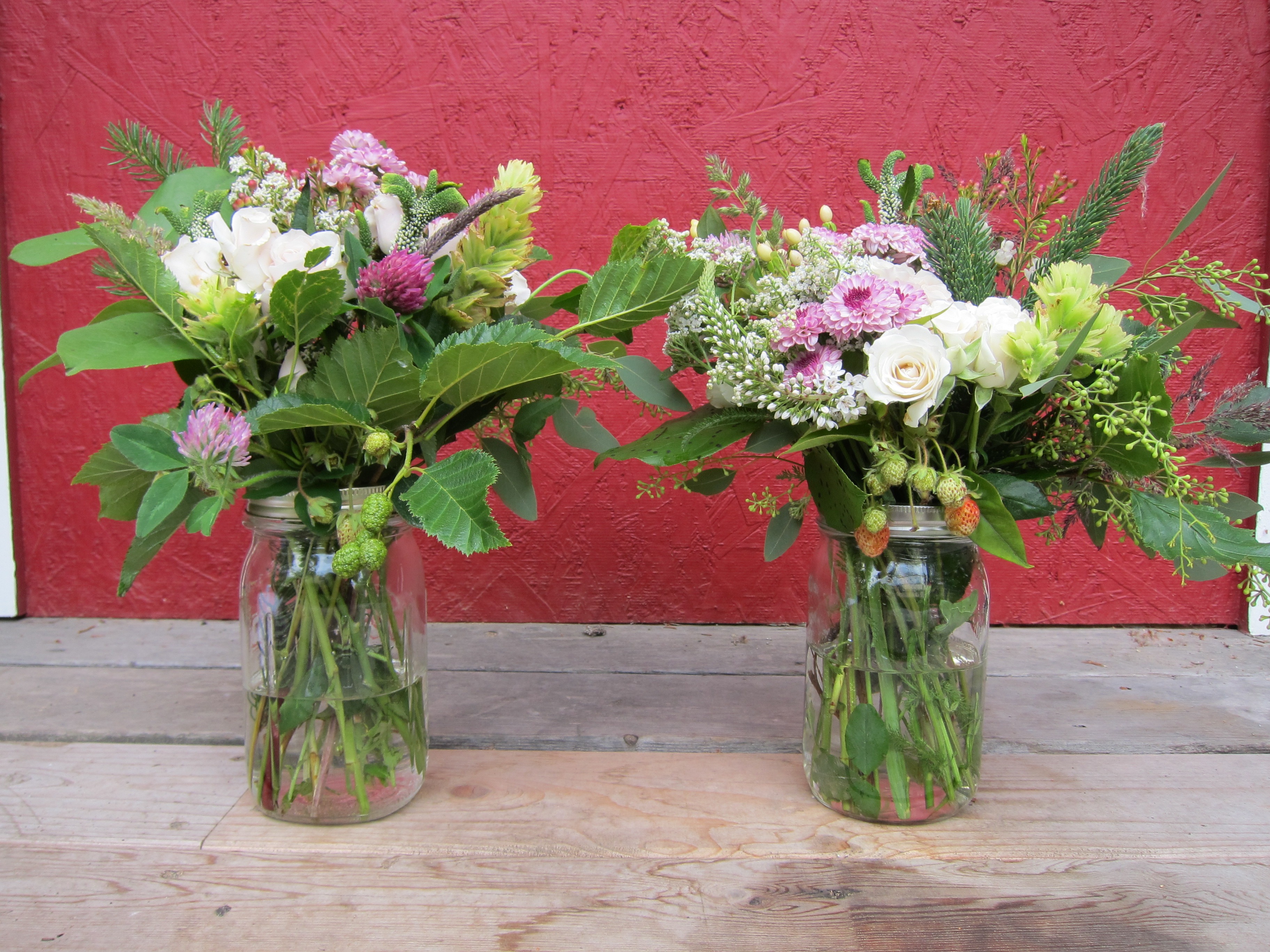 Wild Alaska centerpiece with spray roses, lavender button mums, wild clover, wild yarrow, alder and wild strawberries. Designed by Natasha Price of Alaksaknitnat.com