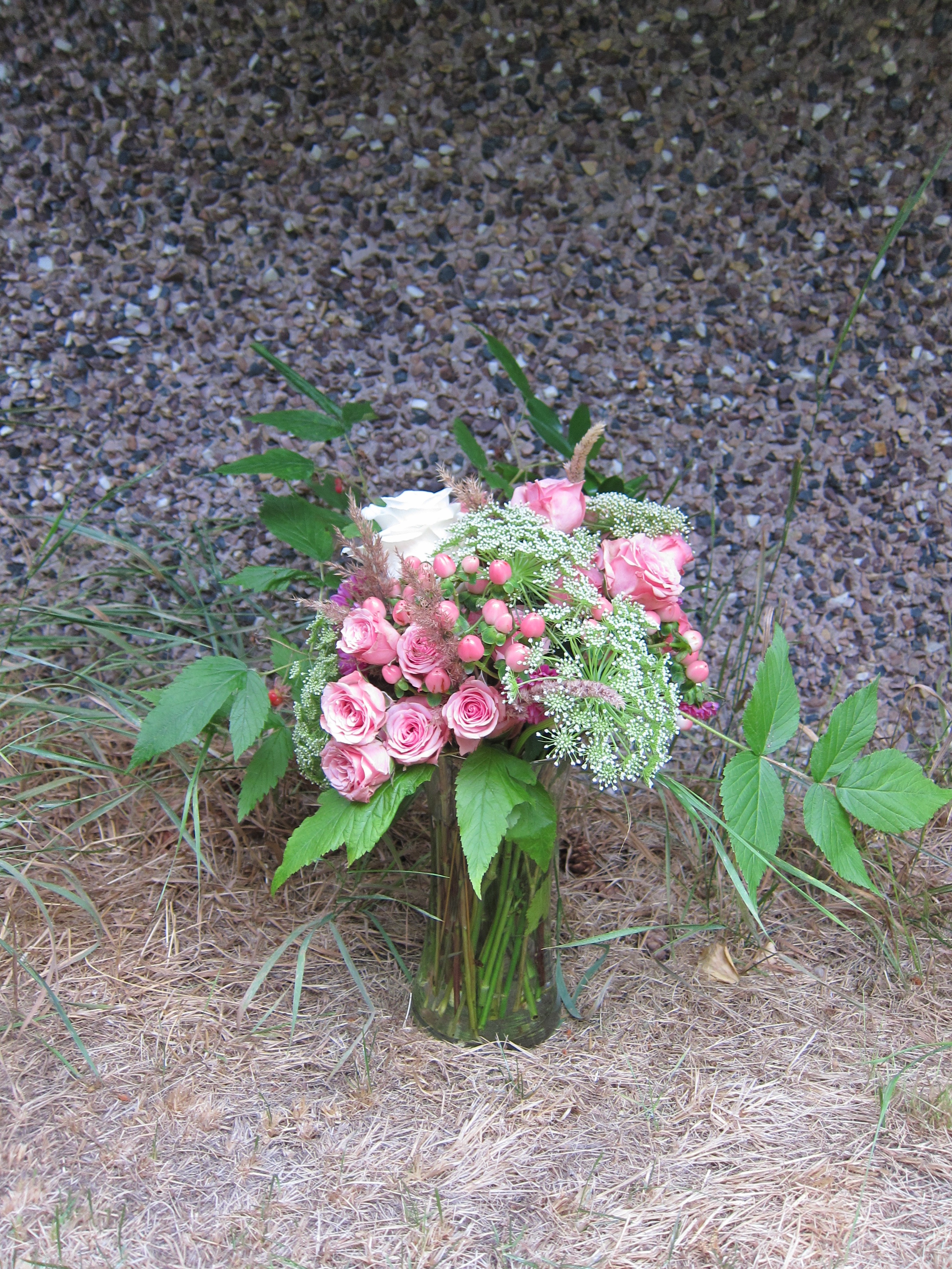 Bouquet made with spray roses, queen Anne’s lace, hypericum berry, Japanese aster and wild raspberry greens | designed by Natasha Price of alaskaknitnat.com