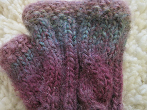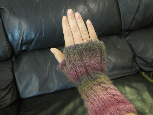 I really wanted to make fingerless gloves to match my headband, but I didn’t want to deal with the individual fingers. I found a pattern for cabled gauntlets, but I didn’t like the gusset design; so I merged my favorite mitten pattern with the cabled gauntlet pattern and came up with these: