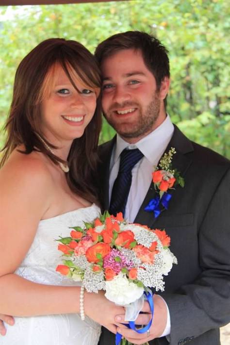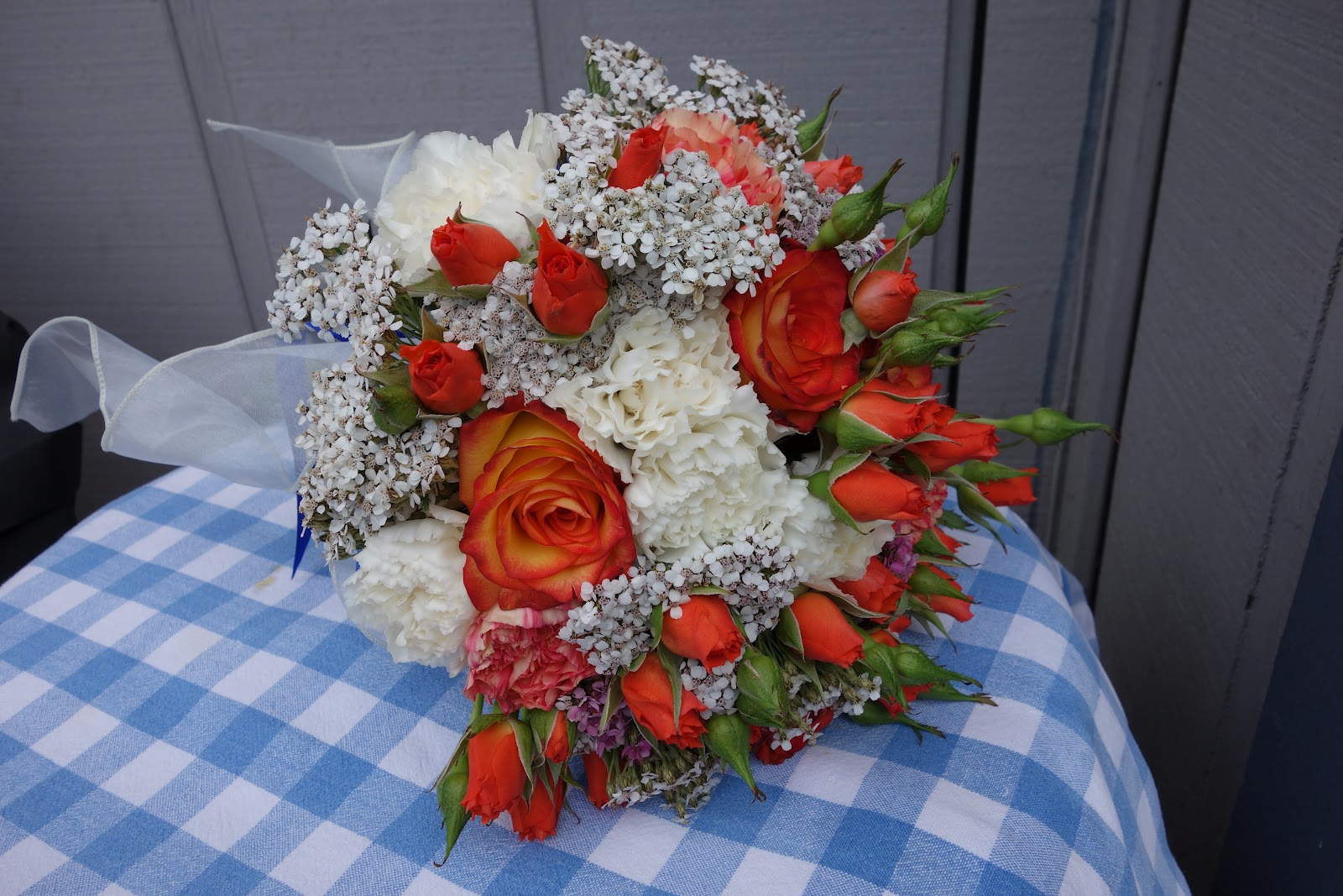 It was a last-minute wedding and the bride asked me last minute to do the flowers on the cheap. That’s my specialty, so it was my pleasure to see what I could whip up. Her colors were blue so I decided on orange and white for the floral arrangements.