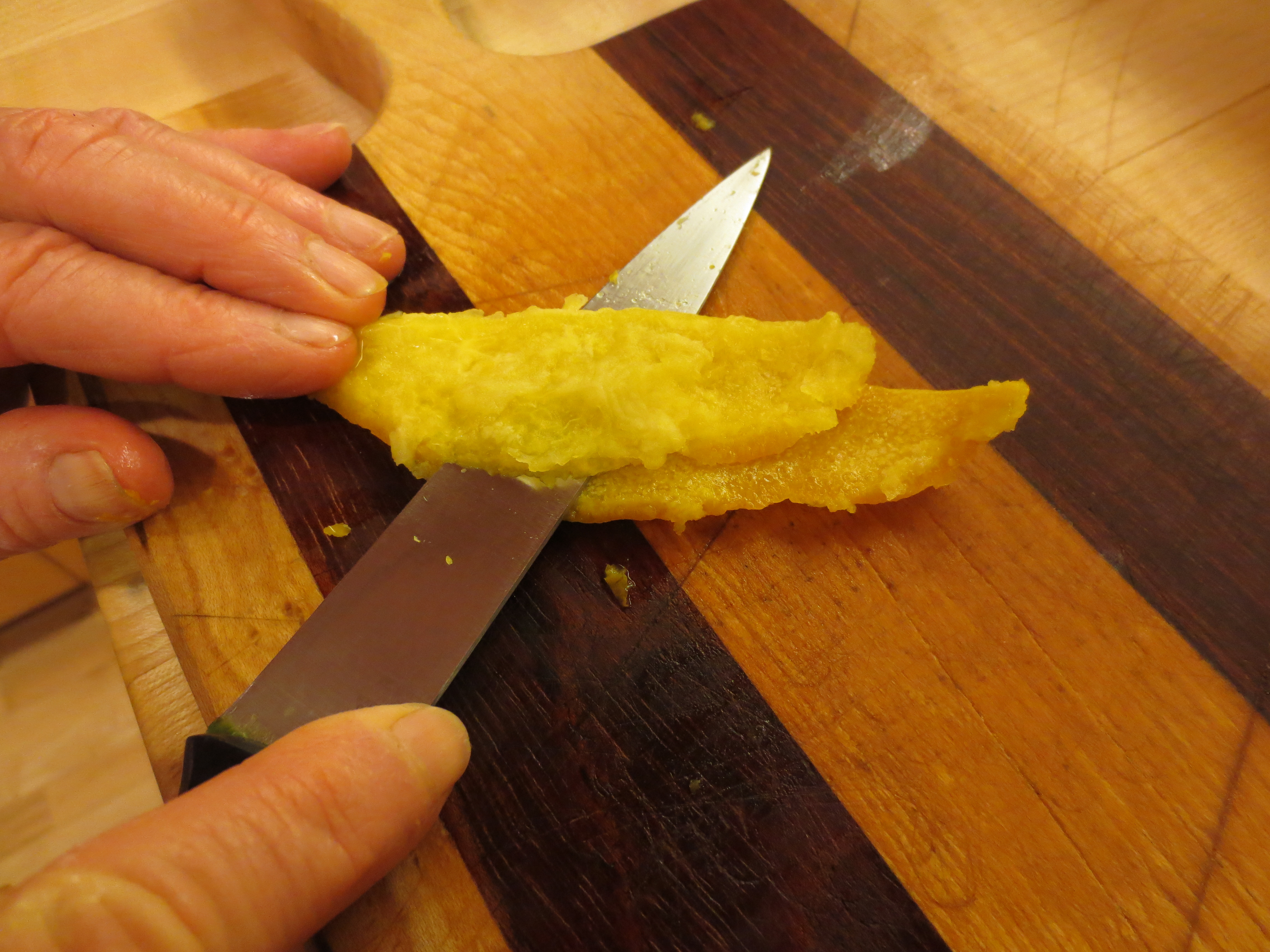 An alternative method is to use a vegetable peeler to peel off the rind and slice it. If you choose this method you won’t need to boil the rinds since they are so thin.