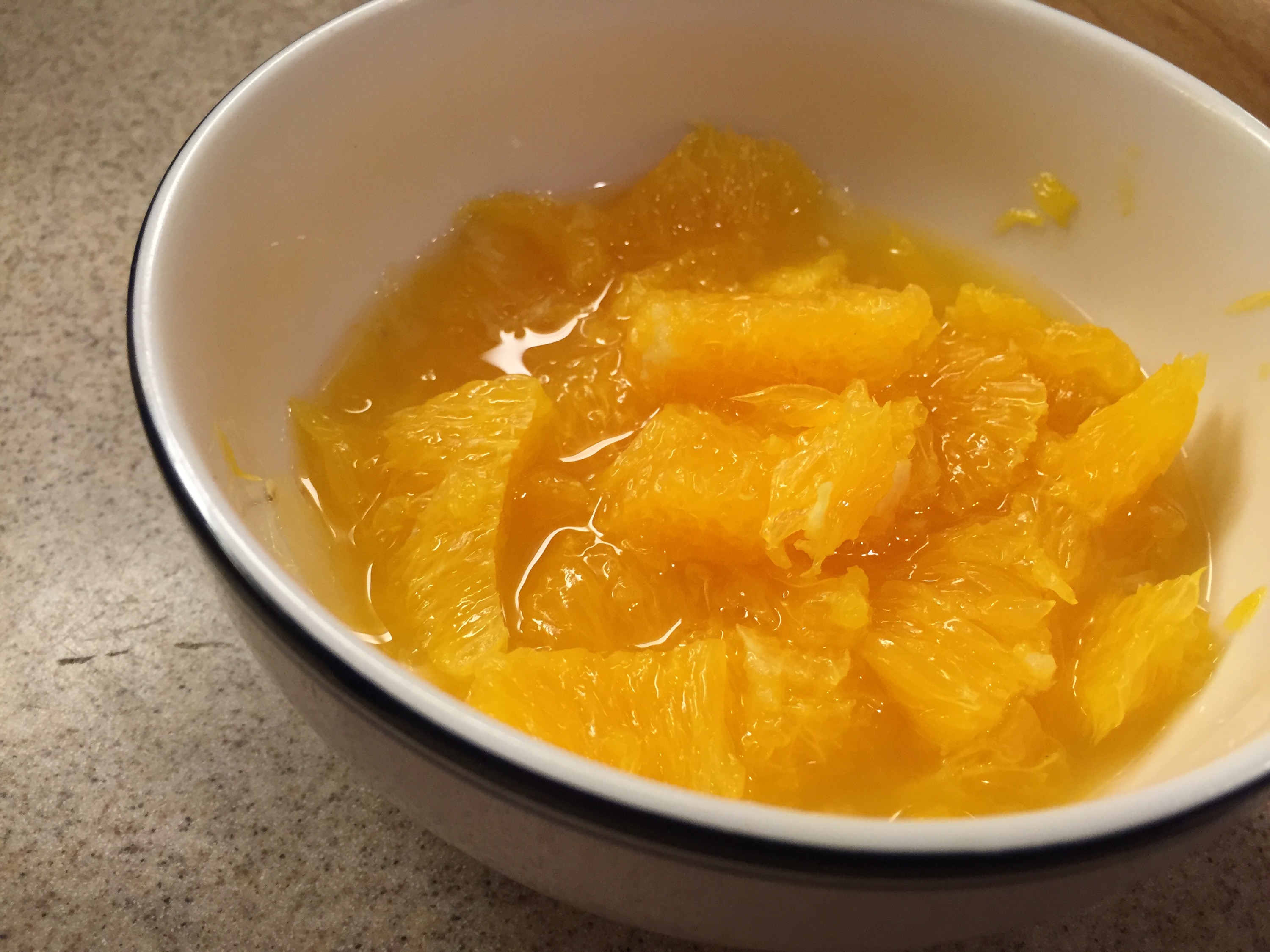 Meanwhile remove the membrane from each orange segment and reserve the pulp in a bowl. Take the membranes in your hands and squeeze the remaining pulp and juice into the bowl. Discard the membranes. If you’re really lazy you could probably use a couple of cans of mandarins, drained and rinsed. I’ve never tried it, but it could work.