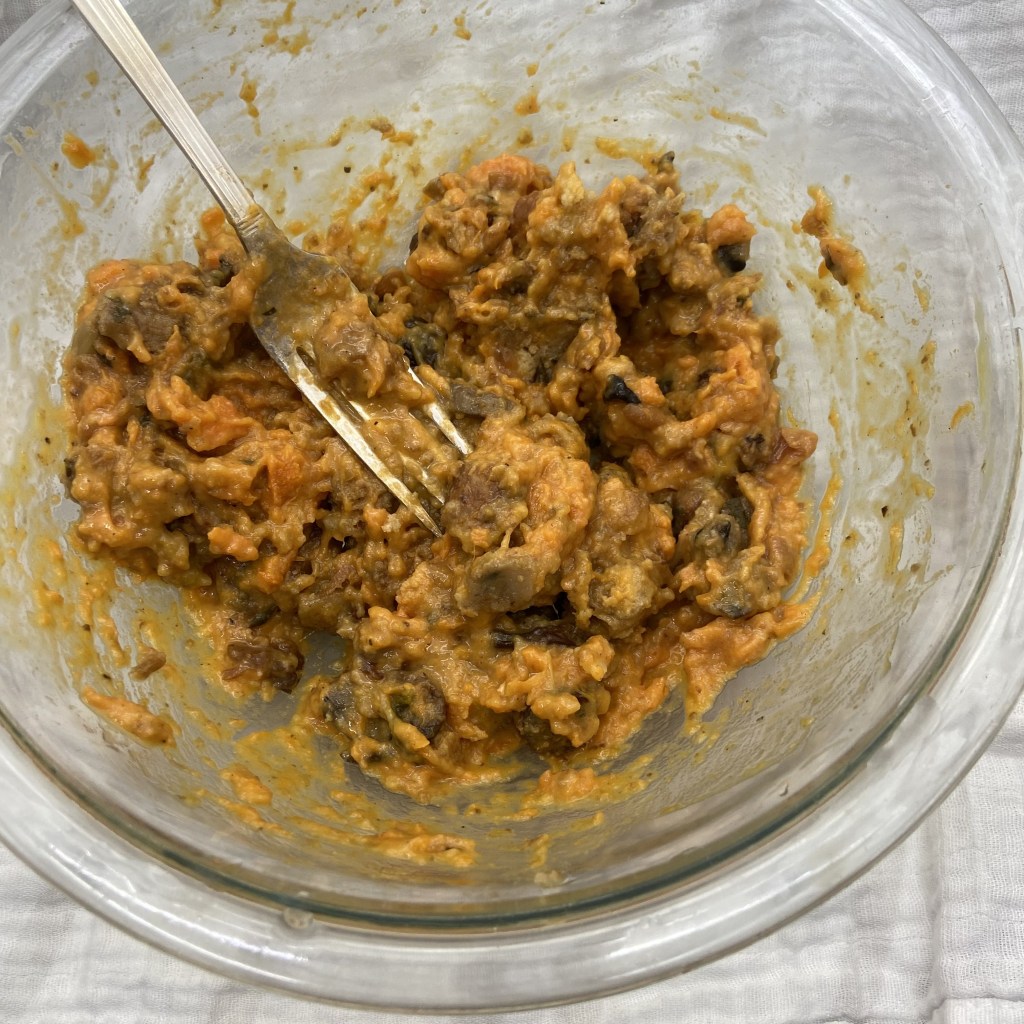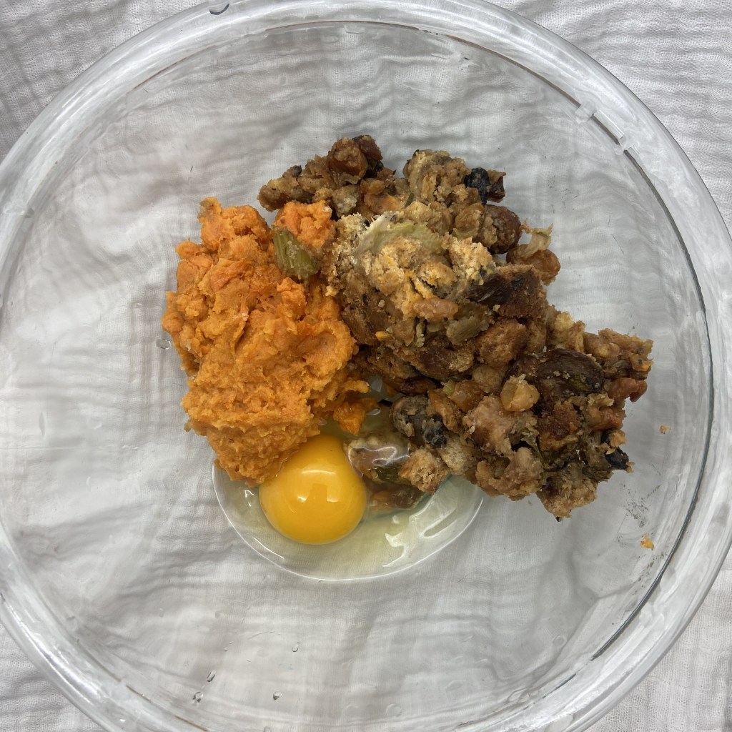 1/2 cup leftover sweet potato casserole (or mashed potatoes with 1/2 teaspoon of maple syrup)