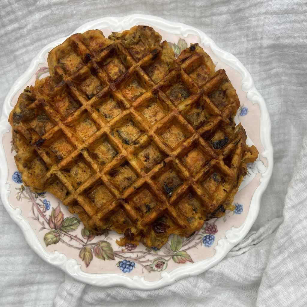 When the waffle iron is heated, spray it liberally with cooking spray. Place your mixture in the waffle iron and cook for 5-6 minutes (this will vary depending on your waffle iron), or until waffle is browned. Serve with cranberry sauce, if desired.