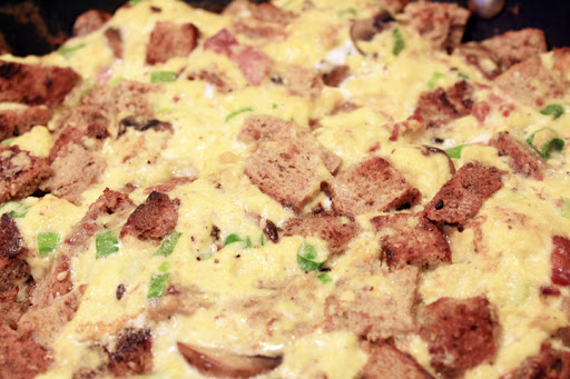 Preheat oven to 475 degrees F. In a small frying pan melt the butter over medium high heat. Add the mushrooms and saute till they are lightly browned on all sides. Set mushrooms aside. In an oven-proof medium skillet, cook the bacon over medium-high heat till crispy. Set aside the bacon and reserve about a tablespoon of bacon grease in the pan. Add bread cubes from only one slice of bread and brown on all sides. Set aside with the untoasted bread cubes. Meanwhile, whisk the eggs and milk in a mixing bowl. Add the salt, pepper, green onions, bacon, mushrooms and cheese. Add the egg mixture to the now empty pan and stir around for about a minute, till eggs are just starting to set. Fold in all the bread cubes and pat everything down with a spatula. Place in oven and cook for 7 minutes.