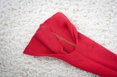 With your circular, cast on 64 stitches and knit last stitch to first stitch without twisting the stitches. K1, P1 for five rounds with main color. Knit two rounds regularly. Cut yarn leaving a four-inch tail. Start knitting with new color. After a few stitches, loosely tie the ends of the two colors together. You’ll tighten this up later, but it’ll help to do this along the way. Knit 2 rounds of each color until you have knit 20 rounds, not counting the ribbing. Switch back to the main color and knit 7 rounds.