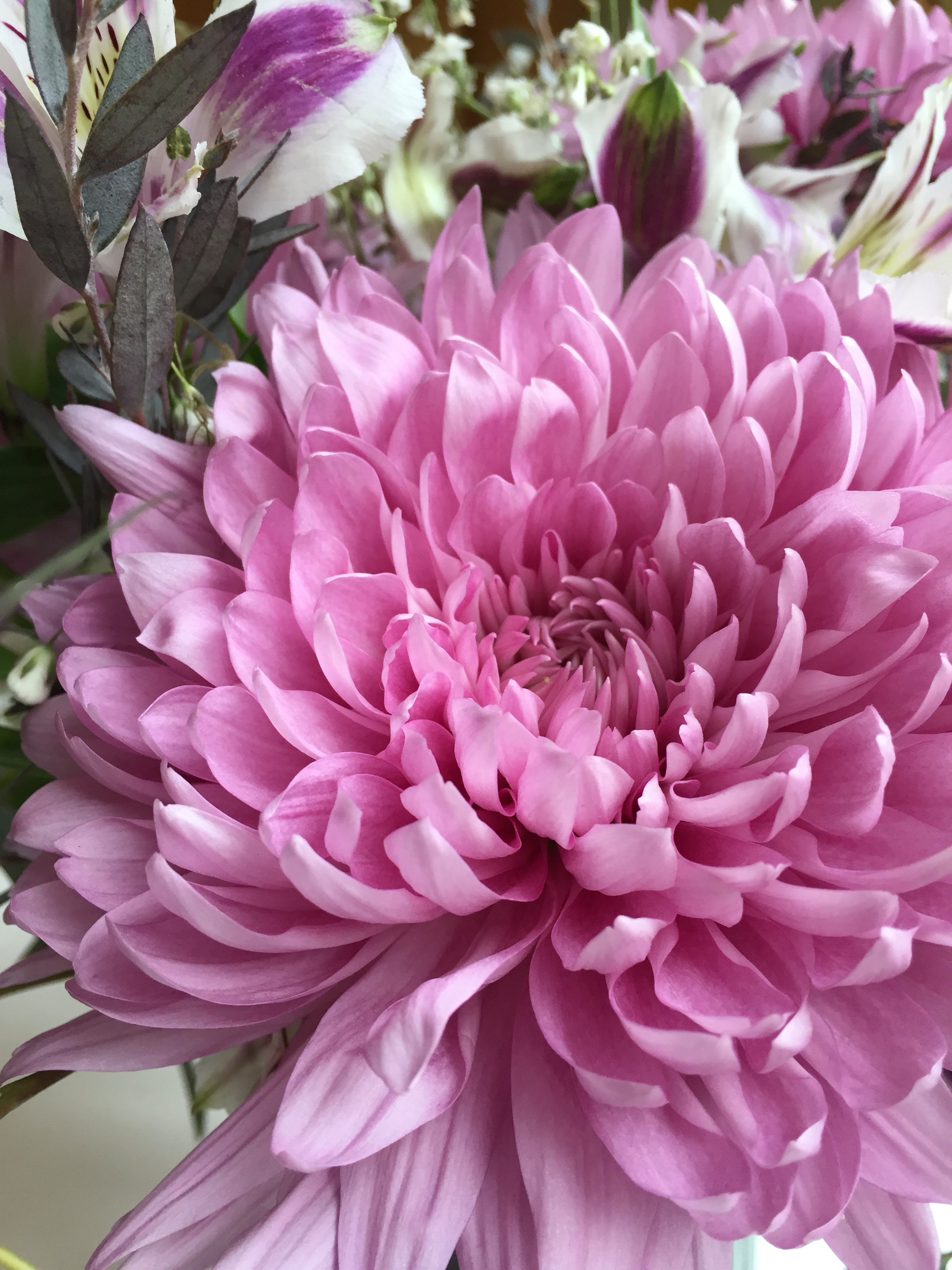 DIY Mother’s Day arrangement | Make a beautiful floral centerpiece in just a few simple steps using eucalyptus, baby’s breath, alstroemeria and football mums. Tutorial by alaskaknitnat.com