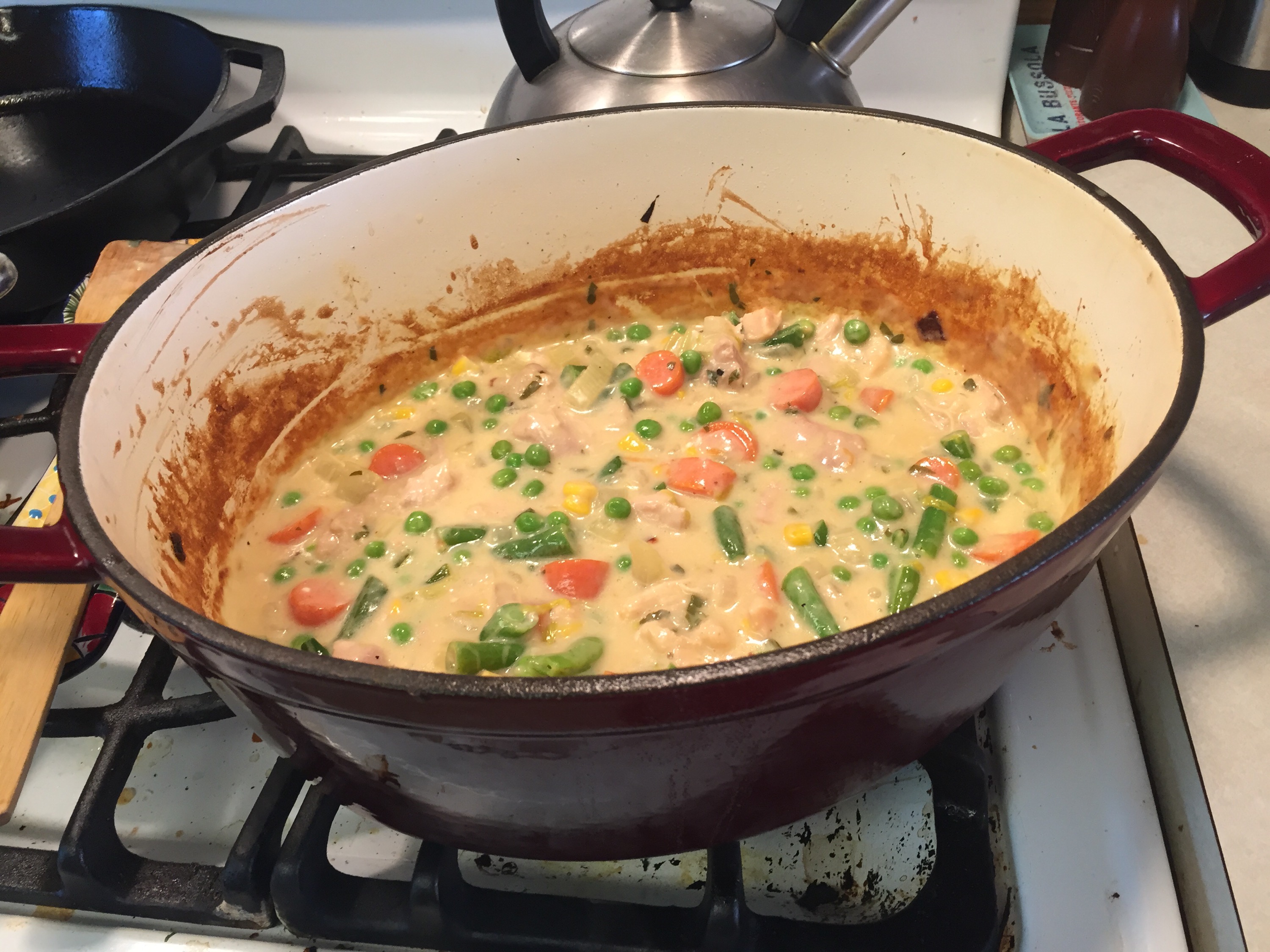 Add the bay leaf, rosemary, thyme, chicken stock and the corn cob. Bring to a simmer, cover, and let simmer for about 20 minutes, until the carrots are soft.
